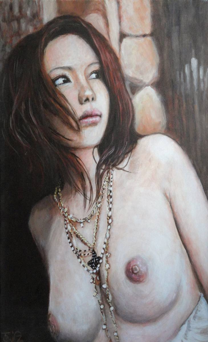 To dzieło przyciąga wzrok swoją subtelną paletą barw, dominującymi odcieniami brązu i beżu. W centrum kompozycji znajduje się postać kobiety, której wyraz twarzy sugeruje zadumę lub może nostalgię. Patrzy w bok, a jej włosy zdają się delikatnie falować, dodając dynamiki i życia. Artysta zastosował technikę olejną, co widać w miękkich przejściach kolorystycznych i głębi obrazu. Tło, z subtelnymi plamami światła, przypomina kamienne mury, co wprowadza surową atmosferę kontrastującą z delikatnością kobiecej skóry. Obraz emanuje spokojem, jednak jednocześnie kryje w sobie tajemnicę. Może budzić uczucia tęsknoty czy refleksji nad przemijaniem. Twist w tej historii to nastrój dreamy, unoszący się w powietrzu – jakbyśmy przeszli na krótki moment do innego, bardziej introwertycznego świata. Dla 7-letniego dziecka, obraz może być zagadką: "Dlaczego ona patrzy tam?" Malarska technika subtelnie buduje kontrasty, używając delikatnych pociągnięć pędzla. Moje osobiste przemyślenie: obraz ten, choć stonowany, pozostawia widza z poczuciem niedosytu, jak niedokończona opowieść.