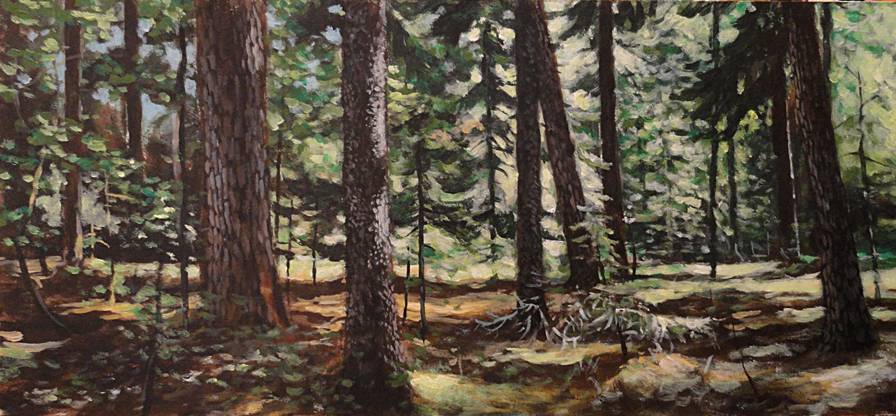 Obraz przedstawia malowniczy las, gdzie zieleń gra pierwsze skrzypce. Wszechobecne drzewa dominują w kompozycji, rozciągając swoje pnie jakby chciały sięgnąć nieba. Przez liście delikatnie przesącza się słoneczne światło, tworząc intrygującą grę cieni na miękkiej ściółce. Kolory są bardzo naturalne, ziemiste tony idealnie oddają wilgotność i zapach lasu, który niemal czuć. Sposób, w jaki artysta uchwycił detale kory, zdradza jego techniczną biegłość. Atmosfera jest spokojna, niemal sielankowa. Czuję, jakbym mógł tu usiąść i medytować przez godzinę. Jest coś magicznego w tym, jak cisza lasu bije z obrazu. Jednocześnie, jest w tym wszystkim nutka tajemnicy, jakby zaraz zza drzewa miał wyskoczyć jakiś leśny stwór. Styl obrazu można by nazwać realistycznym, z odrobiną impresjonizmu w sposobie oddania światła. Artysta z ogromnym wyczuciem wykorzystał pociągnięcia pędzla do stworzenia tekstury liści i traw. Emocje? Zdecydowanie subtelne. Czuję spokój z nutką nostalgii. Patrząc na ten obraz, myślę: "Ale by było fajnie tam być!" It's a place to escape. Dla siedmiolatka: "To wygląda jak las w bajce, gdzie mieszkają wróżki!" Refleksyjnie, myślę o naturze i jej potędze. Jest pięknie. Punkt.