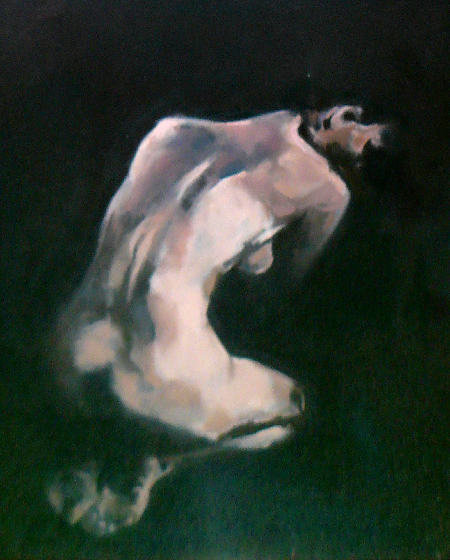 Obraz przedstawia postać ludzką, skoncentrowaną w mistycznej pozie, zanurzoną w głębokiej ciemnej palecie kolorów. Dominują tu zielenie i czernie, które tworzą tło dla subtelnie rozświetlonych kształtów cielesnych. Artysta użył delikatnych pociągnięć pędzla, tworząc efekt miękkich, przenikających się linii, co nadaje dziełu elegancji i tajemniczości. To jakby ciało unosiło się w przestrzeni, a może w wodzie? Nastrój obrazu przepełniony jest refleksją i nostalgia. Czuje się ciszę i spokój, które prowadzą do introspekcji. Styl jest nieco impresjonistyczny, z nutą abstrakcji, co pozwala odbiorcom na szeroką interpretację. Technika sfumato dodaje subtelności, a jednocześnie wprowadza element niedopowiedzenia. Dzieło budzi emocje. Może smutek, a może tęsknotę za czymś nienazwanym. Patrząc, zastanawiam się, co artysta chciał przekazać – czy to samotność, wyzwolenie, czy może po prostu kontemplacja. A może to freedom, o którym tak często marzymy? I w tym obrazie, w tej niewinności, jest coś, co przypomina mi kruchość chwili. Duzi chłopcy mówią, że to jest bardzo piękne. Takie prace pozostawiają po sobie ślad. Widzisz, i zaczynasz myśleć, co dla ciebie znaczy ta cisza. To jak sen, z którego nie chcesz się obudzić.