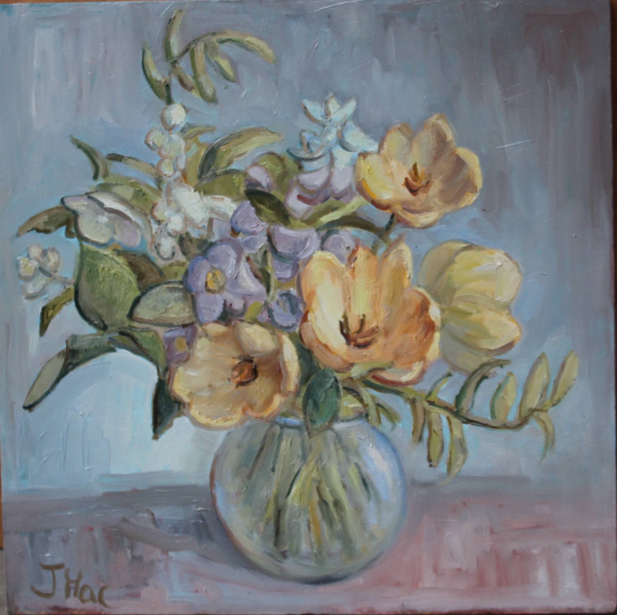 Obraz przedstawia uroczy bukiet kwiatów, który od razu przyciąga wzrok delikatnymi pastelowymi barwami. Żółte i fioletowe kwiaty ułożone są w szklanym wazonie, który subtelnie odbija światło. Tło obrazu jest stonowane, w odcieniach szarości i błękitu, tworząc spokojną atmosferę. Całość emanuje nutką nostalgii, jakby zapraszając widza do chwili zadumy nad prostotą i pięknem natury. Artysta posłużył się techniką impasto, co widać w dynamicznych pociągnięciach pędzla nadających teksturę płatkom kwiatów. Patrząc na obraz, można poczuć ciepło słonecznego popołudnia. Mam wrażenie, że te kwiaty kiedyś rosły w jakimś magicznym ogrodzie. Dzieło ma w sobie coś beztroskiego i radosnego, jak gdyby szeptało "enjoy the moment". Moje dziecko mogłoby powiedzieć: "Te kwiatki są bardzo śliczne, jak w bajce!". Styl obrazu jest swobodny, ale też elegancki, z nutą romantyzmu, co sprawia, że chce się do niego wracać, by zatrzymać się na chwilę i poczuć, jakby czas stanął w miejscu.