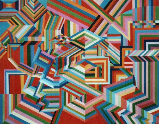Obraz jest istną eksplozją kolorów i kształtów. Dominuje czerwony, ale mieszają się tu również pastele i intensywne odcienie niebieskiego, zielonego czy różowego. Wszystko wiruje w kalejdoskopie geometrycznych form – trójkąty, prostokąty, linie. Artysta stworzył kompozycję pełną dynamiki, która wydaje się nie mieć ani początku, ani końca. Chaos? Może. Ale taki, który hipnotyzuje. Atmosfera dzieła jest niesamowicie żywa, aż chce się uśmiechać. Styl artysty to miks abstrakcji z geometrycznym porządkiem. Techniki? Zdecydowanie precyzyjne nałożenie kolorowych pasów. Mówiąc między nami, jest tu coś niesamowicie przyciągającego oko. Obraz tętni życiem, emanuje energią. To takie dzieło, które wprowadza ruch do statycznej przestrzeni – wow! Patrząc na to, można się poczuć jak na kolorowej karuzeli w wesołym miasteczku. Czy nie przypomina ci to latach dzieciństwa? Moja mama by powiedziała, że to "artystyczne graffiti". A mi się podoba, ale bardzo! Użycie kolorów to istne show. To jak watching a rainbow explode! Pełne emocji, pełne życia.