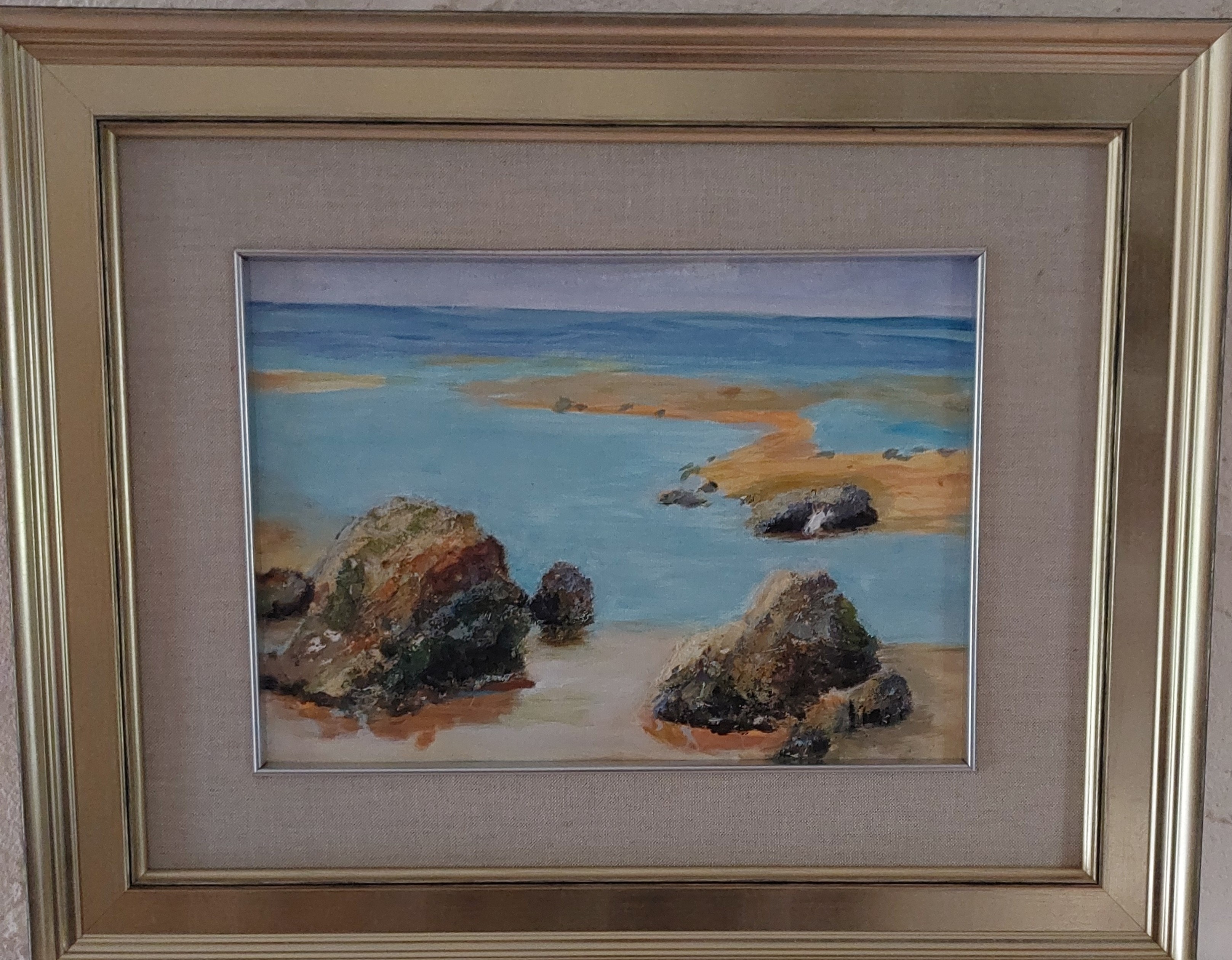 Obraz pięknie oprawiony. Emanujemy od niego spokój. Zastosowano różne techniki malarskie.