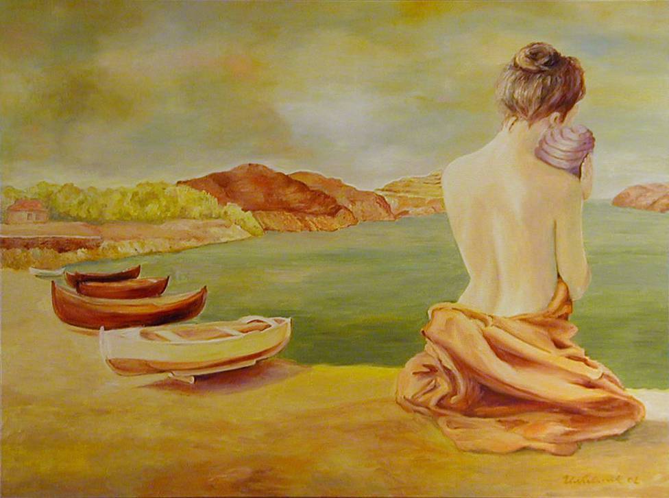 Na obrazie widać nostalgiczny krajobraz nadmorski, pełen ciepłych barw i delikatnych tonacji. Dominują beże, pomarańcze i zielenie, które tworzą harmonijną kompozycję. Kobieta siedzi na plaży, owinięta w delikatny szal, z twarzą odwróconą w stronę muszli. Ta scena emanuje spokojem, jakby czas zatrzymał się w tej jednej chwili. Artysta używa miękkich pociągnięć pędzla, co nadaje obrazowi dreamy quality. Technika ta sprawia, że wszystko wydaje się być zatopione w marzeniach. Samotne łodzie na brzegu zdają się czekać na kolejny dzień pełen przygód. Atmosfera jest refleksyjna, jakby zachęcała do przemyśleń o życiu, podróżach i cichych chwilach nad wodą. Czuję pewną tęsknotę patrząc na tę plażę. Może to tęsknota za miejscem, gdzie można się zgubić w ciszy i wsłuchać w szum fal. Obraz ten może wywoływać skojarzenia z wakacyjnym luzem, momentami, gdy czas płynie inaczej. Łatwo można sobie wyobrazić, jak dziecko krztusa, "Patrz, jak mama słucha tej dużej muszki!" Ten obraz to nie tylko krajobraz, to też emocjonalna podróż w głąb własnych wspomnień.