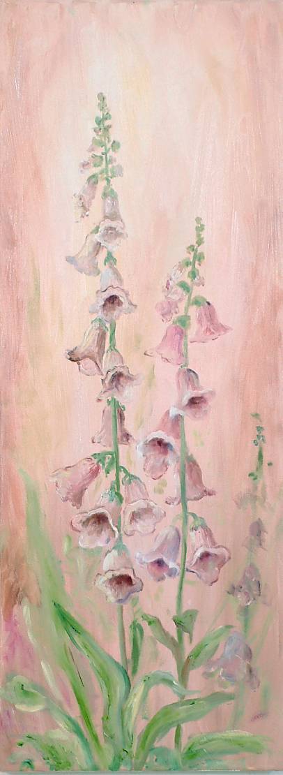 Obraz przedstawia delikatne, pastelowe kwiaty dzwonków, które unoszą się na tle subtelnie różowego nieba. Kolory są jakby rozmyte, roztopione w sobie nawzajem, tworzą miękką, harmonijną kompozycję. Kwiaty pną się w górę, ich kontury są lekko rozmazane, co dodaje im eteryczności. Ta scena emanuje spokojem, ciszą letniego poranka. Czujesz, jakbyś mógł niemal usłyszeć szum wiatru wśród tych wysokich łodyg. Artysta zastosował technikę impasto, nakładając farby w grubszych warstwach, co można zauważyć w niektórych partiach kwiatów. Dzięki temu obraz zyskuje nieco trójwymiarowego charakteru. Są też wyczuwalne subtelne pociągnięcia pędzla, które dodają dynamiki i energii temu z pozoru statycznemu przedstawieniu. Patrząc na ten obraz, czujesz się trochę jak na wsi, gdzie czas płynie wolniej. Może to nostalgia za beztroskimi dniami? Może echo dawnych wspomnień z dzieciństwa. Ach, chciałoby się tam być i powąchać te kwiaty. Wow, really! W tym dziele jest coś niewinnego, coś, co przypomina o prostych radościach życia. Kiedy spojrzysz na to z perspektywy dziecka, myślisz: "Kwiaty są jak magiczne trąbki!" Czyż nie jest to urocze? Artysta naprawdę złapał esencję piękna natury.