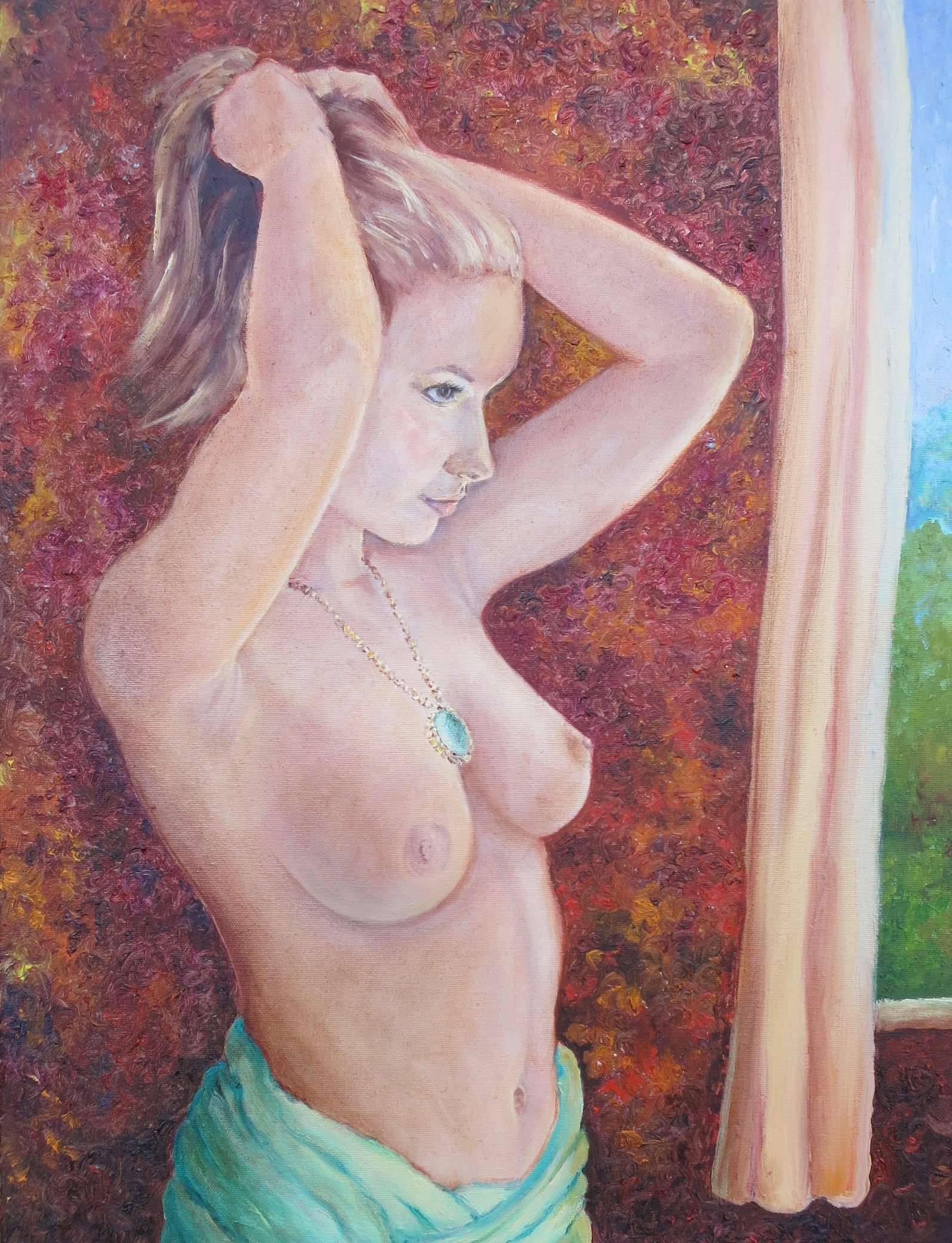 Obraz dziewczyna z szafirem uchwyca naturalne piękno kobiecego ciała, a także piękny szmaragdowy kolor szafiru i chusty modelki.