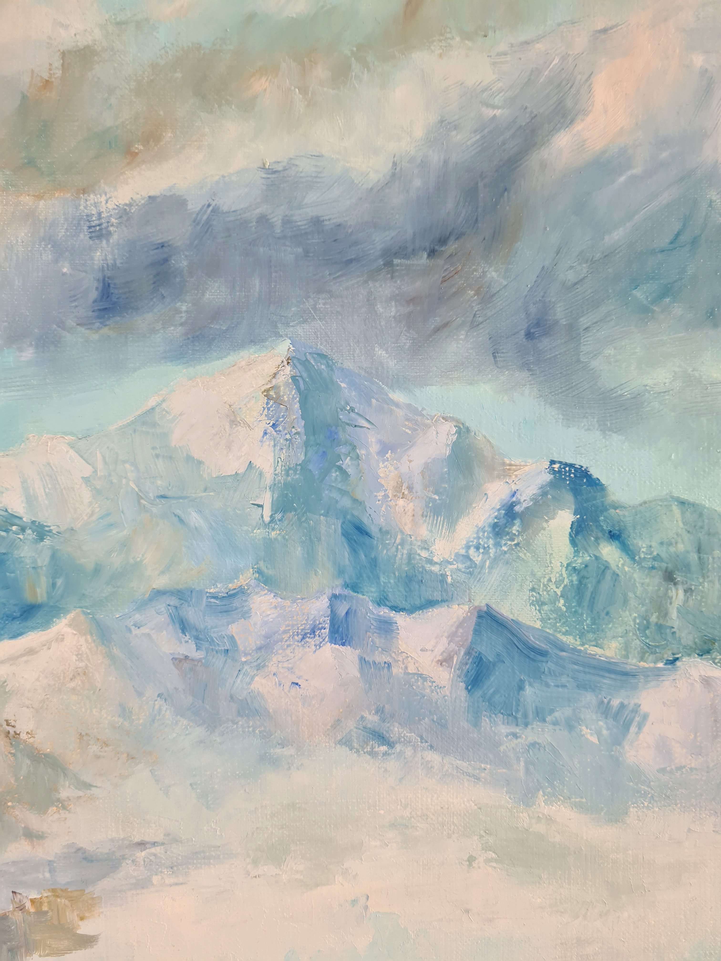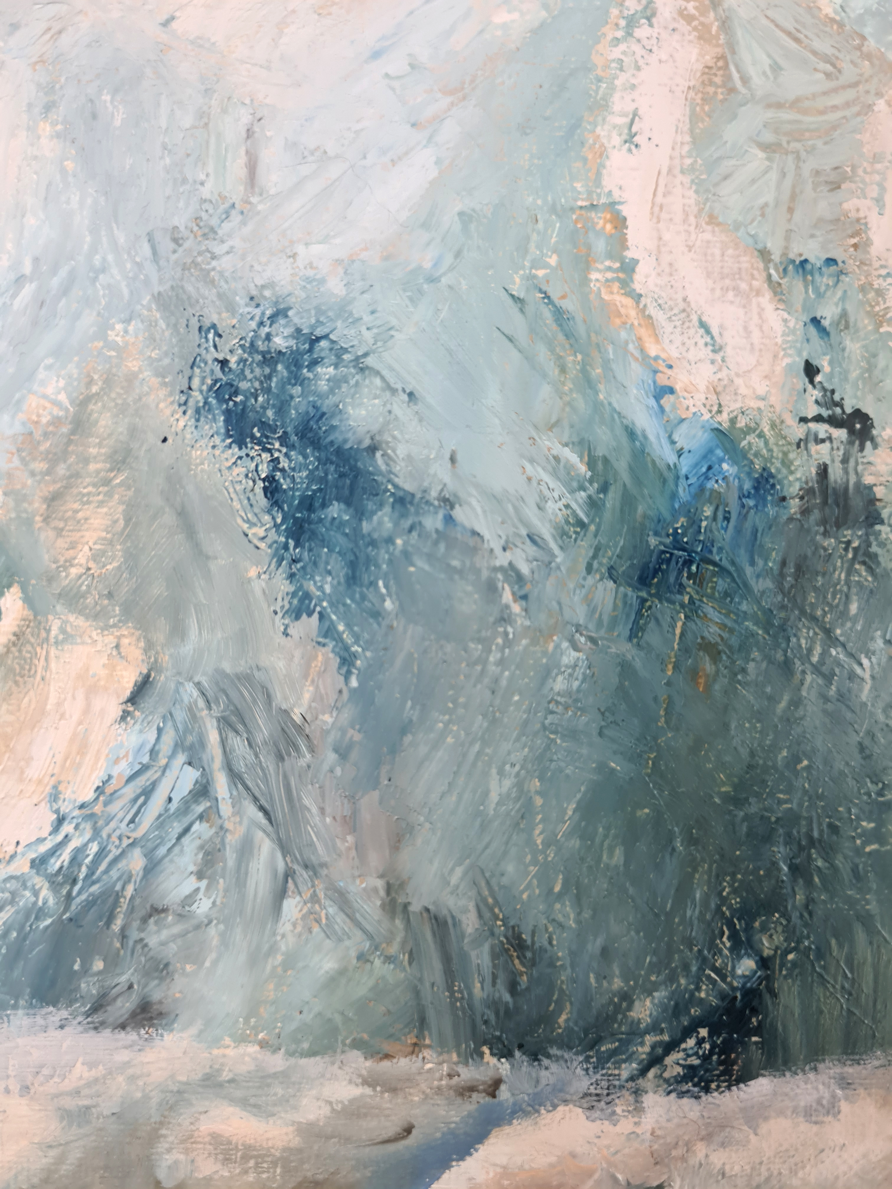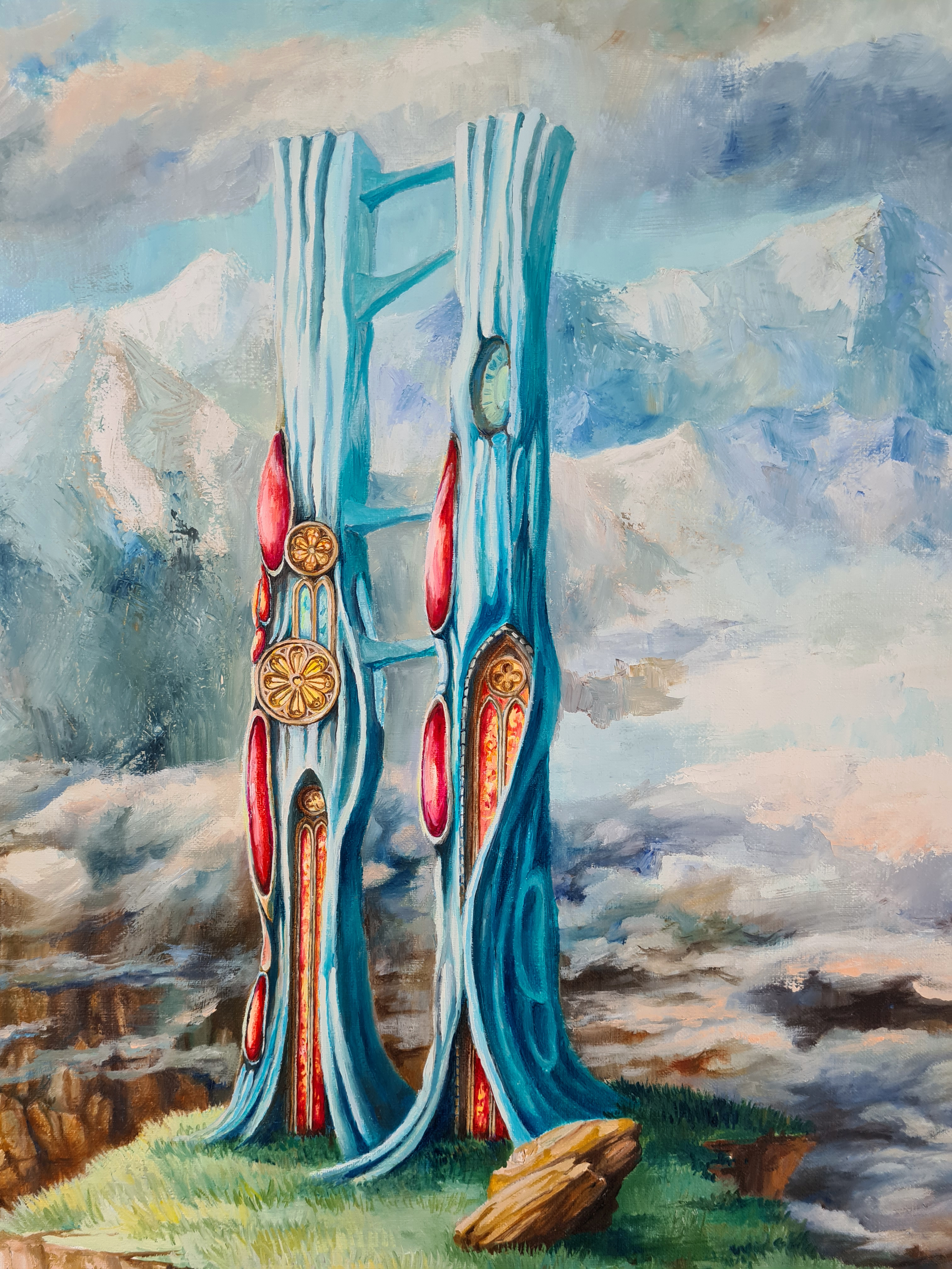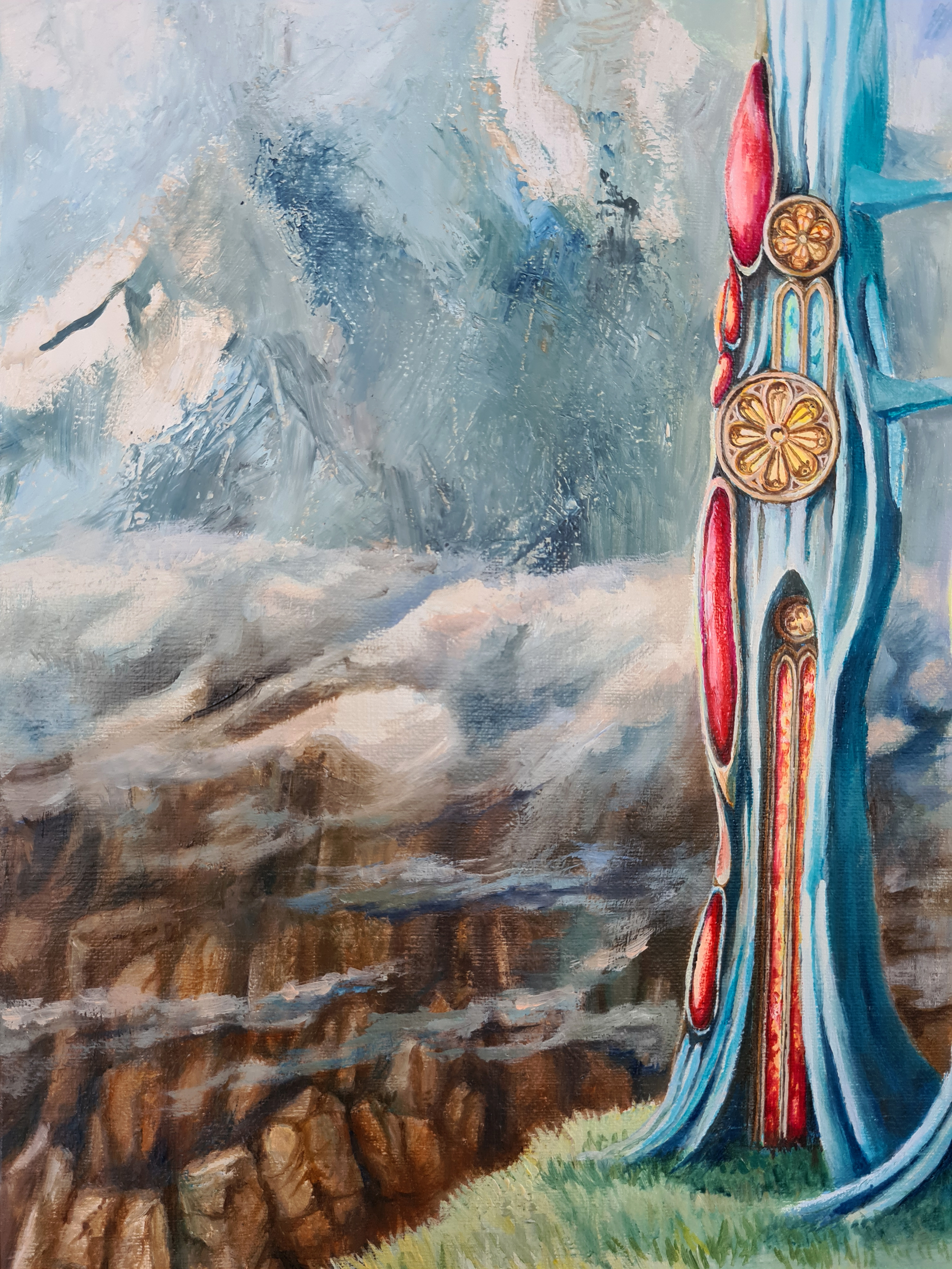 Obraz olejny na płótnie, zamalowane boki będące kontynuacją obrazu. Podpisany p.d, opisany na odwrocie. Częściowo malowany szpachlą.