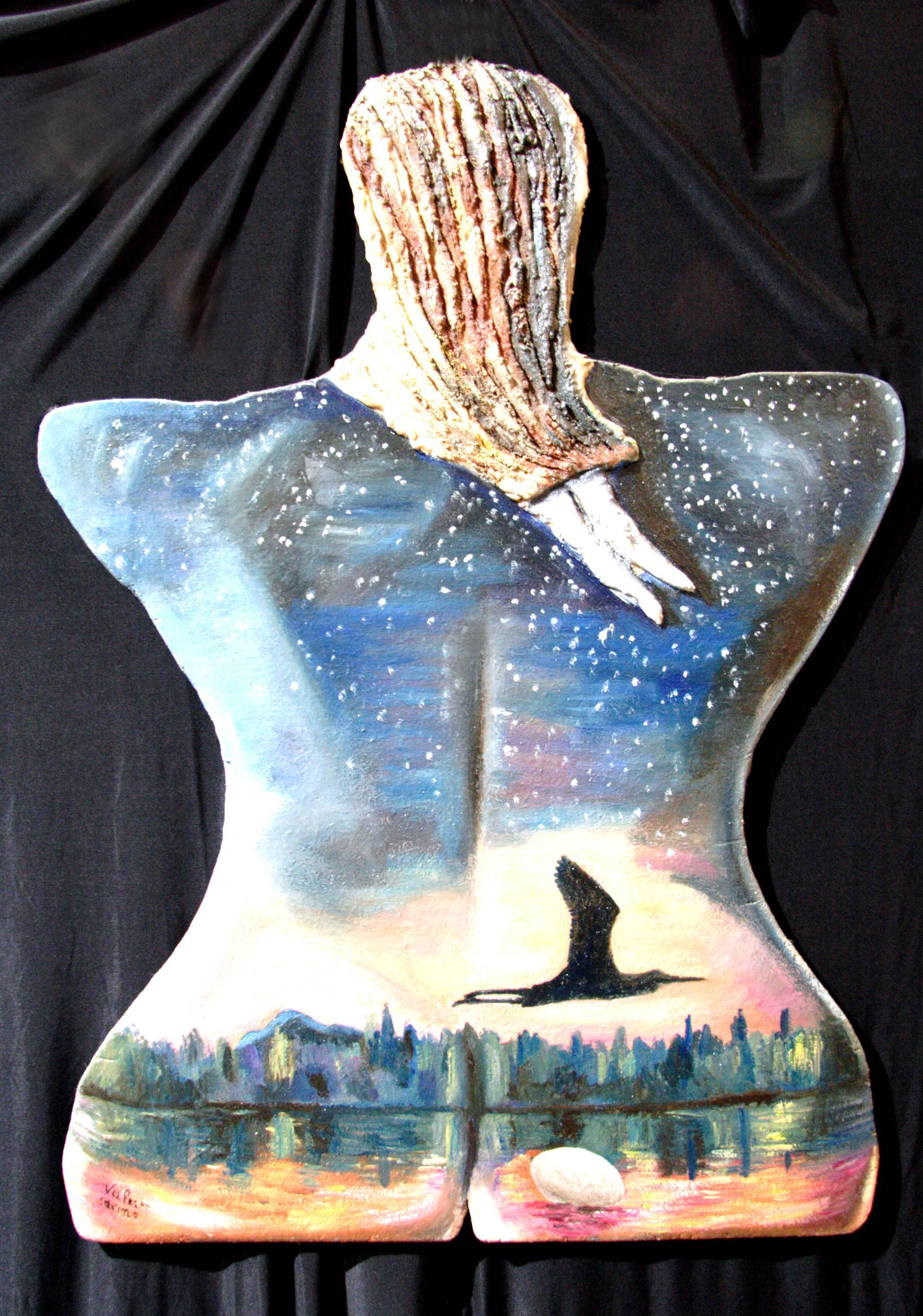 Obraz jest zachwycający, pełen tajemnicy i surowego piękna. Powierzchnia przypomina nieco fakturę kory drzewa, a na niej pełno drobnych jasnych plamek niczym gwiazdy na nocnym niebie. Kompozycja jest lekko asymetryczna, co dodaje jej dynamizmu i sprawia, że widz zatrzymuje się dłużej, by dokładnie przyjrzeć się szczegółom. Kolory są głęboko nasycone, dominują odcienie błękitu, zieleni i ciepłe barwy zachodzącego słońca, co stwarza wrażenie spokoju z nutką niespokojnej tajemnicy. Dzieło emanuje atmosferą refleksji i kontemplacji. Jest jak sen - magiczny, lecz jednocześnie niemalże namacalny. Technika artystyczna zdaje się łączyć elementy malarstwa z rzeźbą, co nadaje obrazowi unikalny trójwymiarowy efekt. To trochę jakby dzieło chciało opowiedzieć nam historię - historii lasu, ptaka nad jeziorem, ludzkiego pragnienia wolności. Patrząc na obraz, czuję spokój i pewną melancholię. Dla mnie to invitation to dream. Przypomina mi czas, kiedy jako dziecko siedziałem w lesie i patrzyłem, jak zachodzi słońce. Mojemu kotu by się spodobał. Dzięki tak różnorodnym elementom, każdy może znaleźć coś dla siebie, poczuć coś unikalnego. Czyż to nie jest fascynujące, że prosty obraz, kilka warstw farby, może tak wzbudzać emocje i pobudzać wyobraźnię? Dzieło zdaje się mówić: zobacz mnie, poczuj, odkryj.