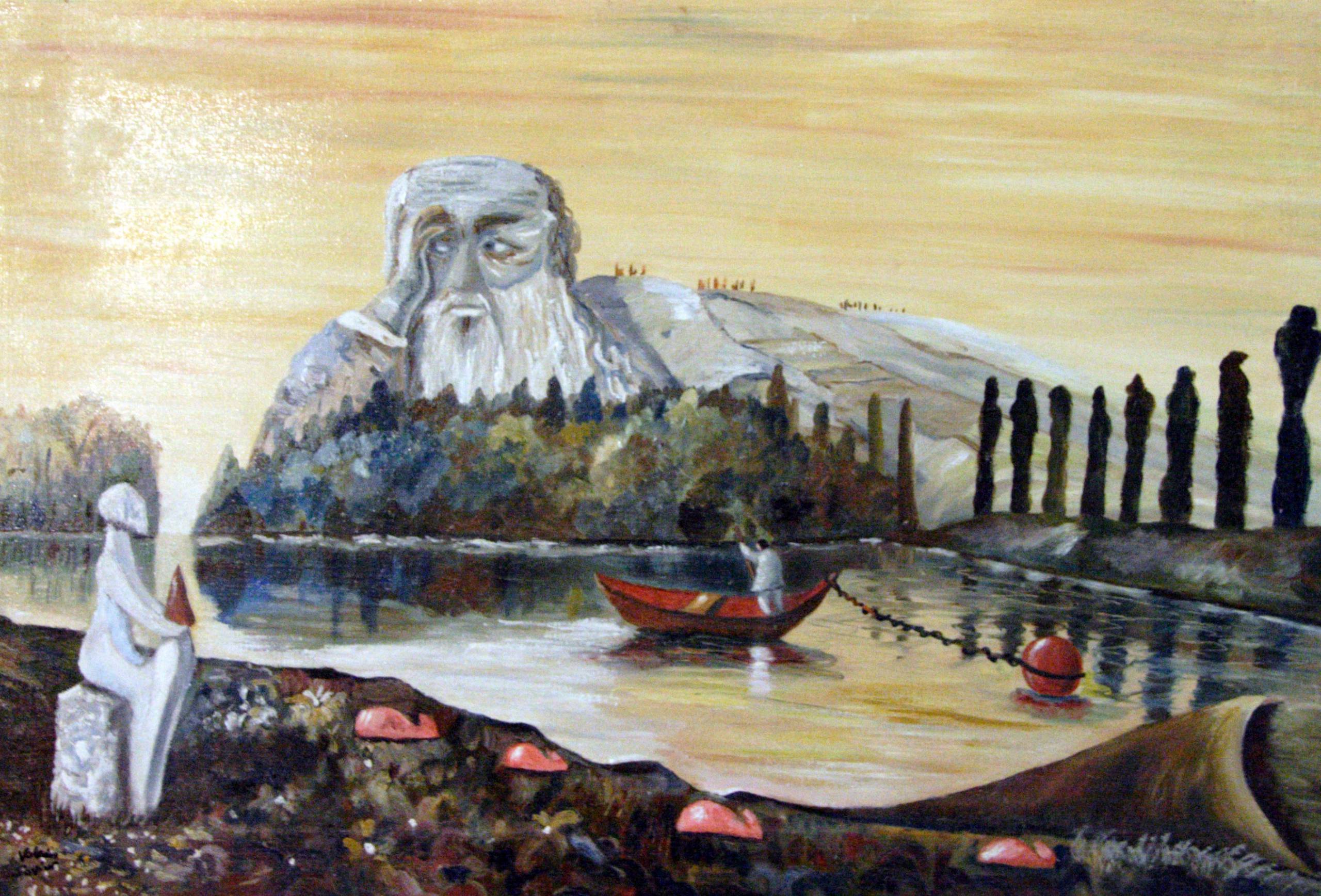 Obraz jest jak sen. Znajduje się na nim jezioro otoczone ciemnymi, tajemniczymi drzewami, w promieniach pomarańczowego nieba. Na horyzoncie widać ogromną, skalistą głowę przypominającą starca. Jego twarz jest zamyślona. Może to czarodziej albo duch przeszłości? Statyczna postać siedząca na brzegu przyciąga wzrok, jakby zatopiona w myślach. Kto wie, co knuje. Ciche odbicie łodzi na wodzie emanuje spokojem, chociaż nie można oprzeć się wrażeniu, że zaraz coś się wydarzy. Nieco surrealistyczny styl obrazu, z jego miękkimi pociągnięciami pędzla, sprawia, że scena jest jakby zatrzymana w czasie. Czujesz tę ulotność momentu? To takie magiczne. Obraz może wywołać uczucie spokojnej nostalgii, a może nawet lekkiego niepokoju. Jakby ukrywał swoje historie. Co tam siedzi w tej wodzie? Jest w tym jakaś tajemnica, którą chcesz odkryć. Shadowy wygląd drzew to pewny znak, że mamy do czynienia z surrealizmem, a także delikatnym stopniem realizmu. Wow, takie obrazy to cudowne okno do innego świata.