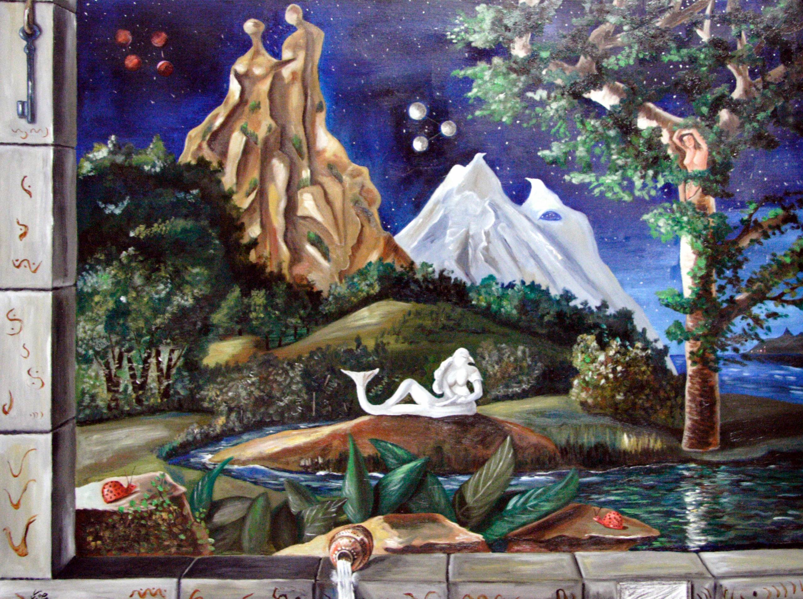 Obraz emanuje tajemniczą aurą, w której granatowe niebo kontrastuje z jasnymi kształtami przypominającymi góry. W centrum kompozycji widać intrygującą figurę syreny, spoczywającą na skalnym brzegu. Wokół niej, jakby z letargu, ożywa zaciszny krajobraz w zieleni i brązach. Niby sen, niby jawa, całość wydaje się być urzekającym pejzażem marzeń. Klucz tajemnic wiszący z lewej strony zdradza sekretne powiązania pomiędzy elementami obrazu. To dzieło pulsuje spokojem, ale i delikatnym niepokojem. Styl artystyczny przypomina surrealizm, gdzie rzeczywistość przeplata się z wyobraźnią. Liny i wzory przypominające pismo dodają egzotycznego klimatu. Artysta z wprawą wykorzystał techniki malarskie, operując światłocieniem i fakturą, by stworzyć głęboki, wielowarstwowy obraz. Patrząc na ten obraz, można odnieść wrażenie, że znajdujemy się na granicy między snem a rzeczywistością. Takie obrazy mnie zawsze fascynują! Może to jest tajemniczy portal do innego świata? Coś jest tutaj po prostu "magical". Każdy detal przywołuje kolejne refleksje i emocje, od melancholii po zaciekawienie, od spokoju po fascynację. Kto wie, może to kraina fantazji skąpana w ciszy nocy.