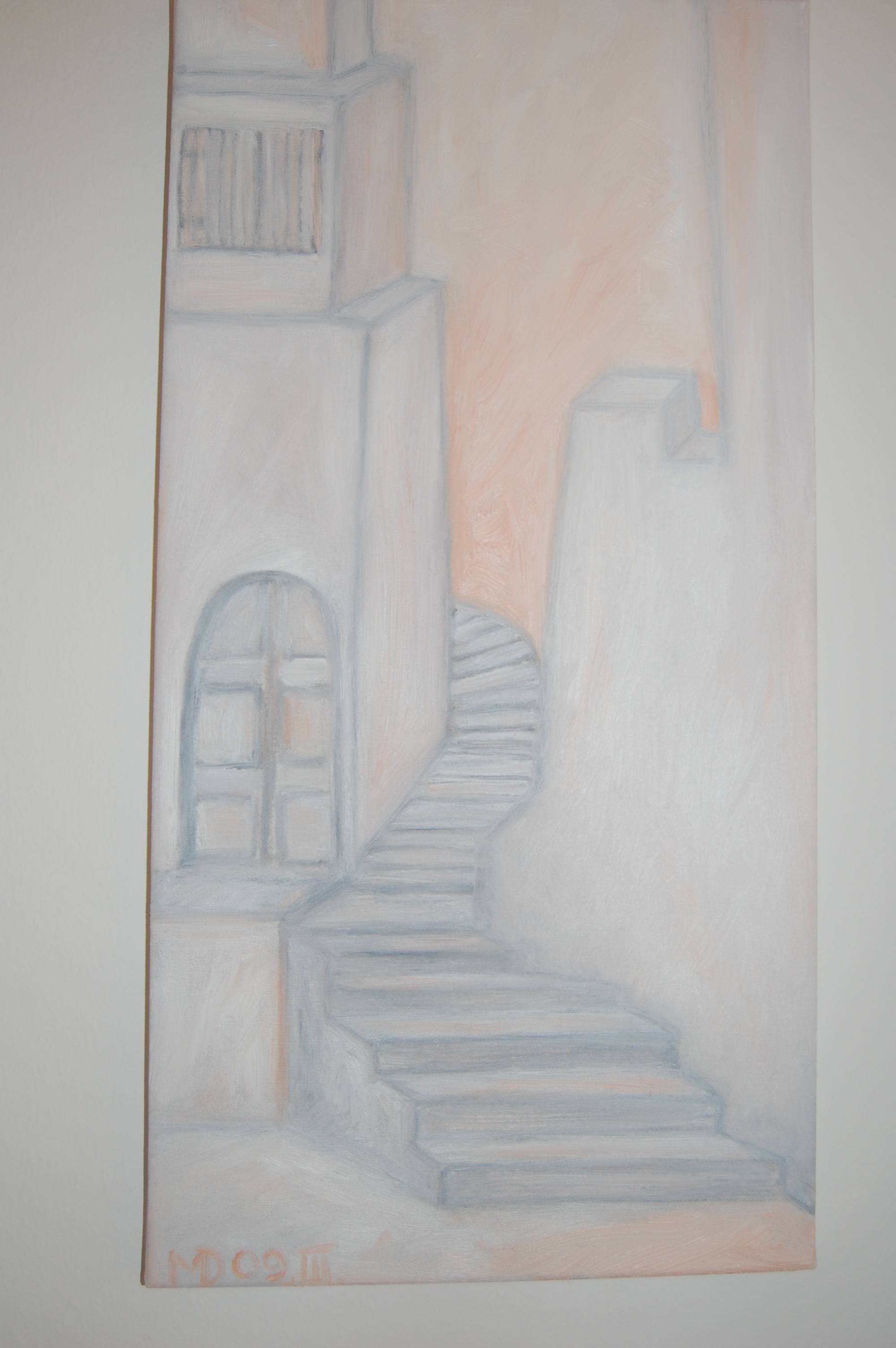 Obraz przedstawia częściowo abstrakcyjne schody, które wiją się ku górze, niemal zapraszając do eksploracji swojego tajemniczego otoczenia. Kolory są delikatne, z przewagą odcieni szarości i bladego pomarańczu, co nadaje dziełu subtelności i spokoju. Kompozycja jest zrównoważona, z wyraźną dominacją geometrycznych kształtów. Te wszystkie proste linie i kąty, z których wyłania się jakaś magiczna sceneria, przywodzą na myśl senne marzenia o ukrytych zakamarkach miasta. Atmosfera obrazu jest eteryczna, niemalże oniryczna. Przez delikatne zastosowanie pastelowych kolorów, emanuje on spokojem i refleksją. Styl jest minimalistyczny, ale z wyraźnym wpływem impresjonizmu, co sprawia, że dzieło jest niemalże "whispering" do odbiorcy. To jeden z tych obrazów, które mogą wywoływać różnorodne emocje. Dla niektórych może być to nostalgia za miejscem, które pamiętają z dzieciństwa, dla innych zaś nieodparta chęć odkrywania nieznanego. Schody prowadzą gdzieś poza ramy płótna, pozostawiając wiele miejsca na interpretację. Kiedy patrzę na to dzieło, czuję jakbym był małym dzieckiem biegającym po starym zamku. Ciekawe co jest na górze. Moje osobiste odczucia to mieszanina spokoju i ciekawości. Gdzie prowadzą te schody? Trudno powiedzieć, ale wiem jedno. Chciałbym tam pójść.