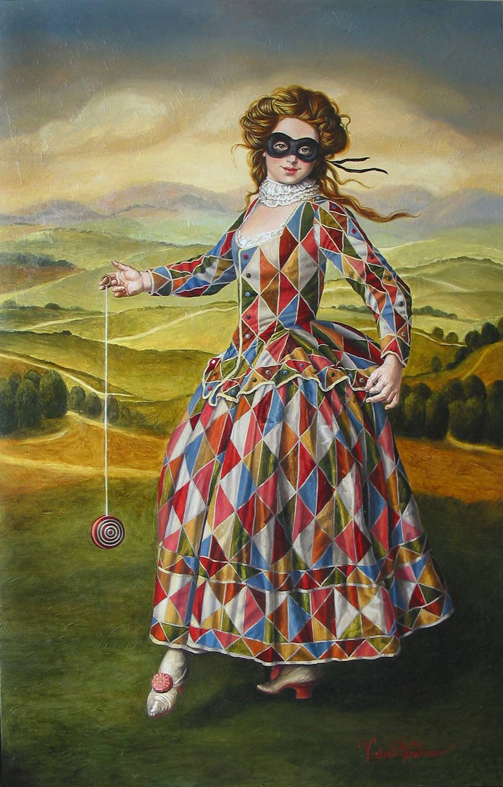 Na obrazie widać postać kobiety w kolorowej sukni, której wzór przypomina misterną mozaikę. Jej suknia, pełna rombów w jaskrawych kolorach - czerwonym, niebieskim, zielonym i żółtym, przyciąga wzrok od razu. Z ręki zwisa jej zabawka yo-yo, co dodaje dziełu lekkości i zabawnego charakteru. Tło obrazu przedstawia rozległy, sepiowy krajobraz, w którym delikatne wzgórza stapiają się z chmurami na horyzoncie. Powietrze niemalże pachnie przygodą. Styl artystyczny obrazu jest klasyczny, ale jednocześnie z nutką surrealizmu. Detale są dopracowane, linie precyzyjne, a kolory intensywne. Atmosfera obrazu jest nieco tajemnicza, a zarazem nostalgicza, jakby patrząc na niego, wracało się do jakiegoś magicznego momentu z dzieciństwa. Można poczuć radość i swobodę. No i trochę takie "wow"! Ciekawie wygląda ta zabawkareczka w rękach kobiety, to jakby zabawa z przeszłości, gdzie czas płynął wolniej. Obraz może budzić u widza uczucie czystej radości i tęsknoty za czasem, gdy wszystko było proste jak zabawa yo-yo.
