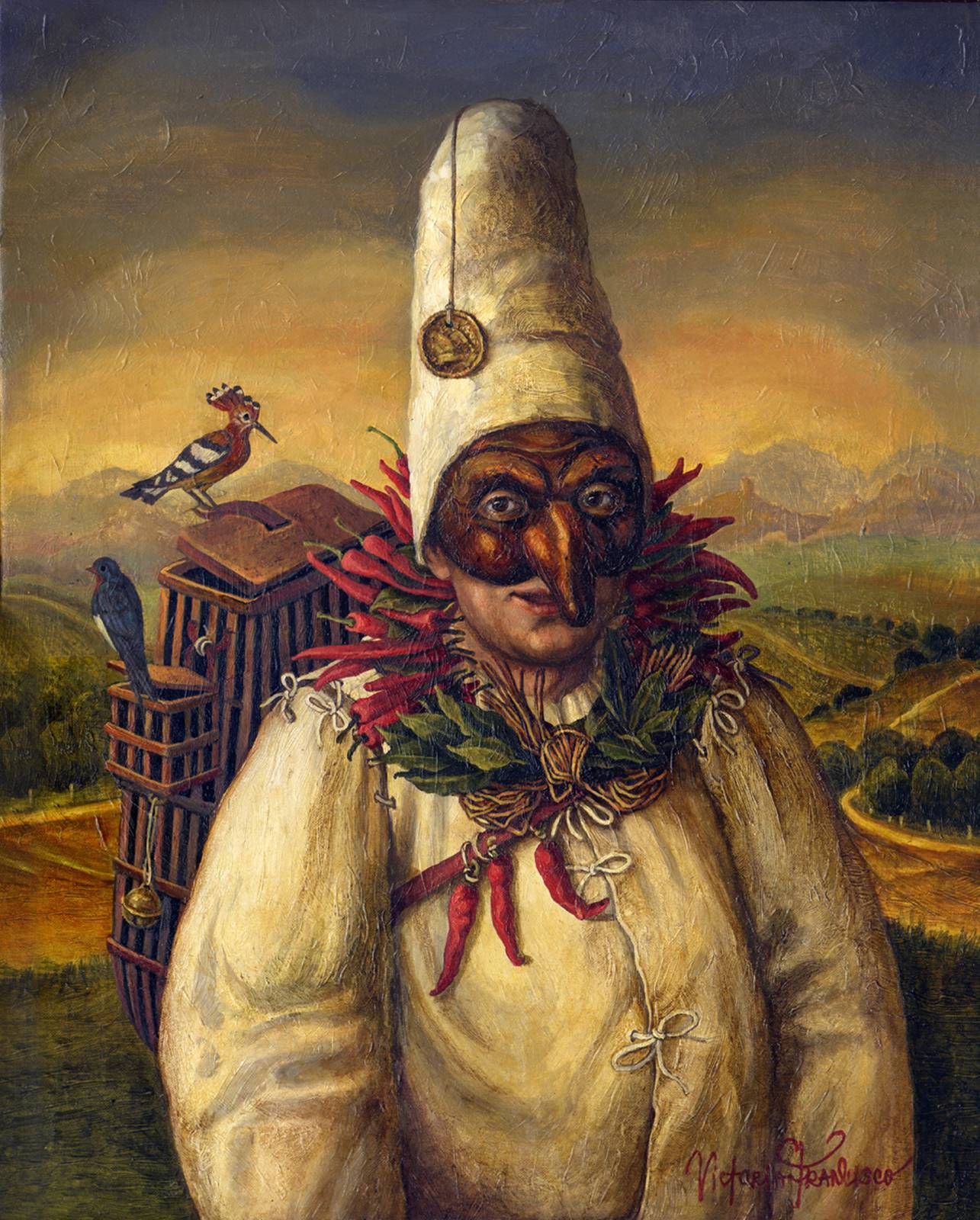 Obraz przedstawia tajemniczą postać ubraną w strój przypominający tradycyjne kostiumy karnawałowe. Jego maska o długim, ptasim dziobie wprowadza nutę surrealizmu. Na pierwszy rzut oka dominują ciepłe, złociste odcienie, które delikatnie kontrastują z zielenią liści i czerwienią papryczek zdobiących szyję postaci. Za plecami widnieje krajobraz pełen łagodnych wzgórz i rozległych pól. Atmosfera obrazu jest trochę dziwaczna, jakby wyciągnięta z jakiegoś snu. Artysta zastosował gładkie pociągnięcia pędzla, co nadaje dziełu klasycznego charakteru, aczkolwiek z lekkim twistem nowoczesności. Patrząc na tę twarz ukrytą pod maską, można poczuć lekki niepokój, ale jednocześnie wciąga jak magnes. Człowiek się zastanawia, kim jest ten osobnik i co schował w koszu na plecach. Wygląda trochę jak postać z bajki – ja też chcę mieć takie maski! Użycie juxtaposition głębokich barw z miękkimi pastelu odcieniami tła tworzy intrygujący kontrast. Obraz może wywoływać refleksje na temat ukrytych intencji i ludzkiej natury, a także zachęcać do zanurzenia się w świecie fantazji i tajemnic. To dzieło zarówno intryguje, jak i przyciąga do głębszego zastanowienia się nad tym, co kryje się za każdą maską.