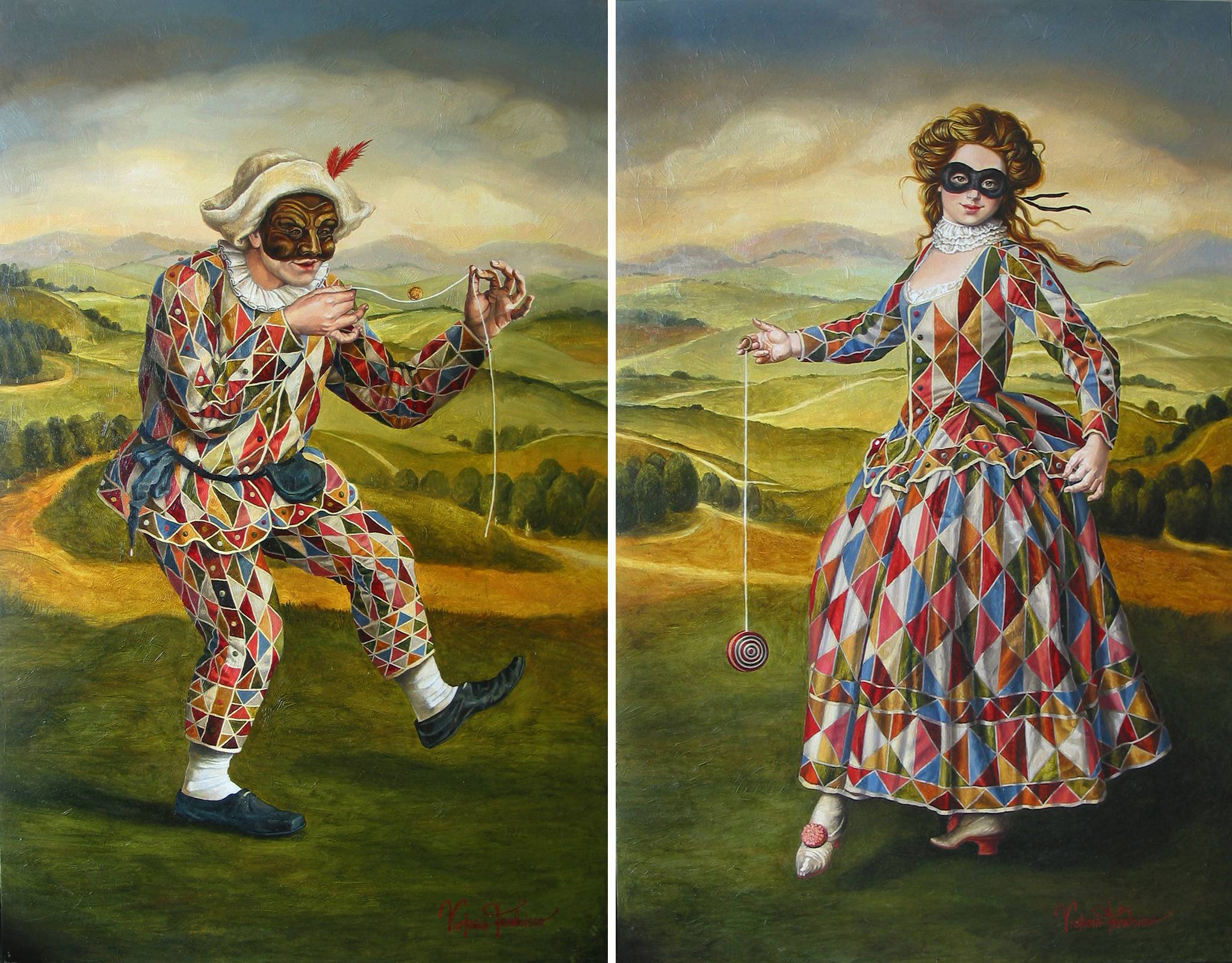 Obraz przedstawia dwie postacie w kolorowych, harlekinowych strojach na tle malowniczego pejzażu. Utrzymane w żywych odcieniach, geometryczne wzory przyciągają wzrok swoją różnorodnością. Tło to spokojne wzgórza, utrzymane w ciepłych tonacjach zieleni i żółci, podkreślające beztroskę sceny. Atmosfera jest jakby magiczna, jakbyśmy przenieśli się do bajkowego świata. Postacie, zamaskowane i pełne tajemnicy, bawią się jojo, co dodaje obrazowi ruchu i dynamiki. Nastrój to mieszanka nostalgii i radości. Styl obrazu jest realistyczny, ale z nutką surrealizmu. Artysta użył delikatnych pociągnięć pędzla, co daje wrażenie głębi i tekstury. Technika ukazuje finezyjne detale, takie jak pióro w kapeluszu czy misternie wykonane maski. Emocje? Hmm, ja czuję radość i pewną niewinność. Obraz może przywoływać wspomnienia o dziecięcej zabawie i niekończącej się wyobraźni. "Look, jojo!" mogłoby wykrzyknąć dziecko, zachwycone sceną. Czy można się tu zanurzyć i zapomnieć o codzienności? Zdecydowanie tak. Moje guziki nostalgic relationship's experience dotykają tych kolorowych figur każdorazowo. To takie magiczne i trochę tajemnicze, jakby odkrywanie dawno zapomnianego snu dzieciństwa.