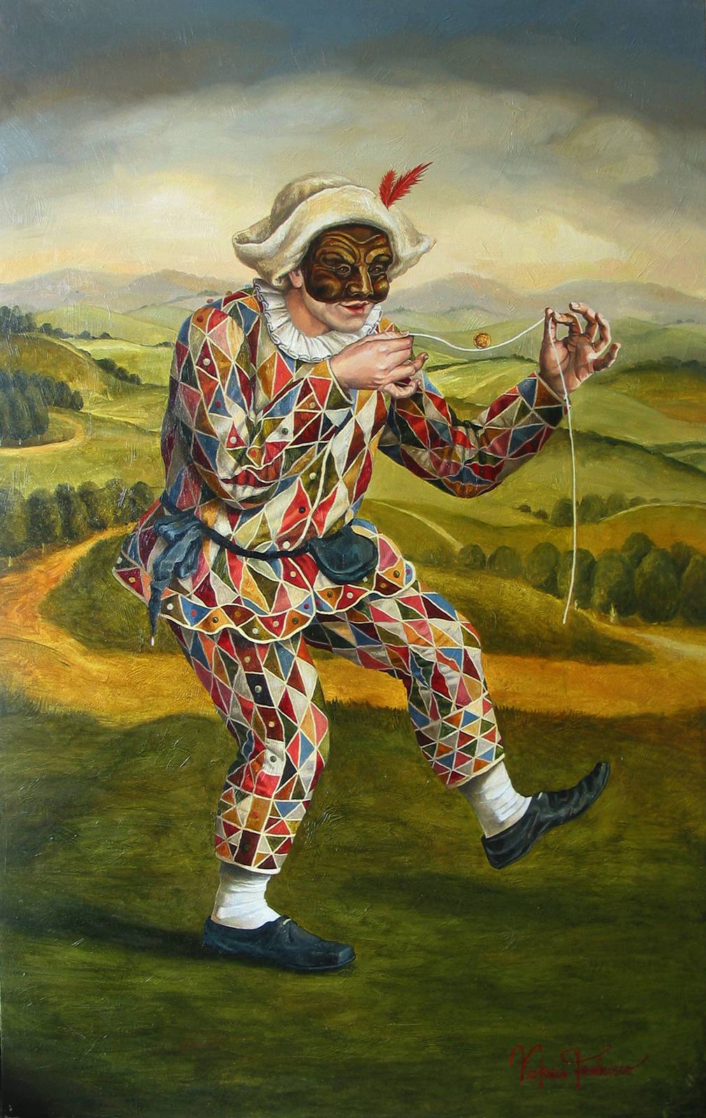 Na obrazie widzimy postać w stroju arlekina, pełnym jaskrawych, geometrycznych wzorów, które przykuwają wzrok. Tło przedstawia malownicze, pagórkowate pejzaże, uderzające w różnorodnych odcieniach zieleni i brązu. Wszystko to tworzy spokojną, lecz nieco tajemniczą atmosferę, której towarzyszy poczucie beztroski. Arlekin, z półuśmiechem na twarzy, bawi się jojo, co dodaje całości nieco komiczny wydźwięk. Artysta zastosował technikę olejną, co widać w delikatnych przejściach kolorystycznych i szczegółowości faktury. Patrząc na obraz, można poczuć nostalgiczną radość, jakbyśmy zaglądali do magicznego świata dzieciństwa. Mnie to przypomina wesołe dni na podwórku! Kompozycja jest dynamiczna, a figury geometryczne na stroju arlekina tworzą wrażenie ciągłego ruchu. Istnieje w tym obrazie coś, co można by nazwać 'timeless joy'. To, jak arlekin balansuje na jednej nodze, zdradza nonszalancką pewność i lekki humor całej sceny. Obraz wywołuje uśmiech i zachęca do chwili zadumy nad prostymi przyjemnościami życia.
