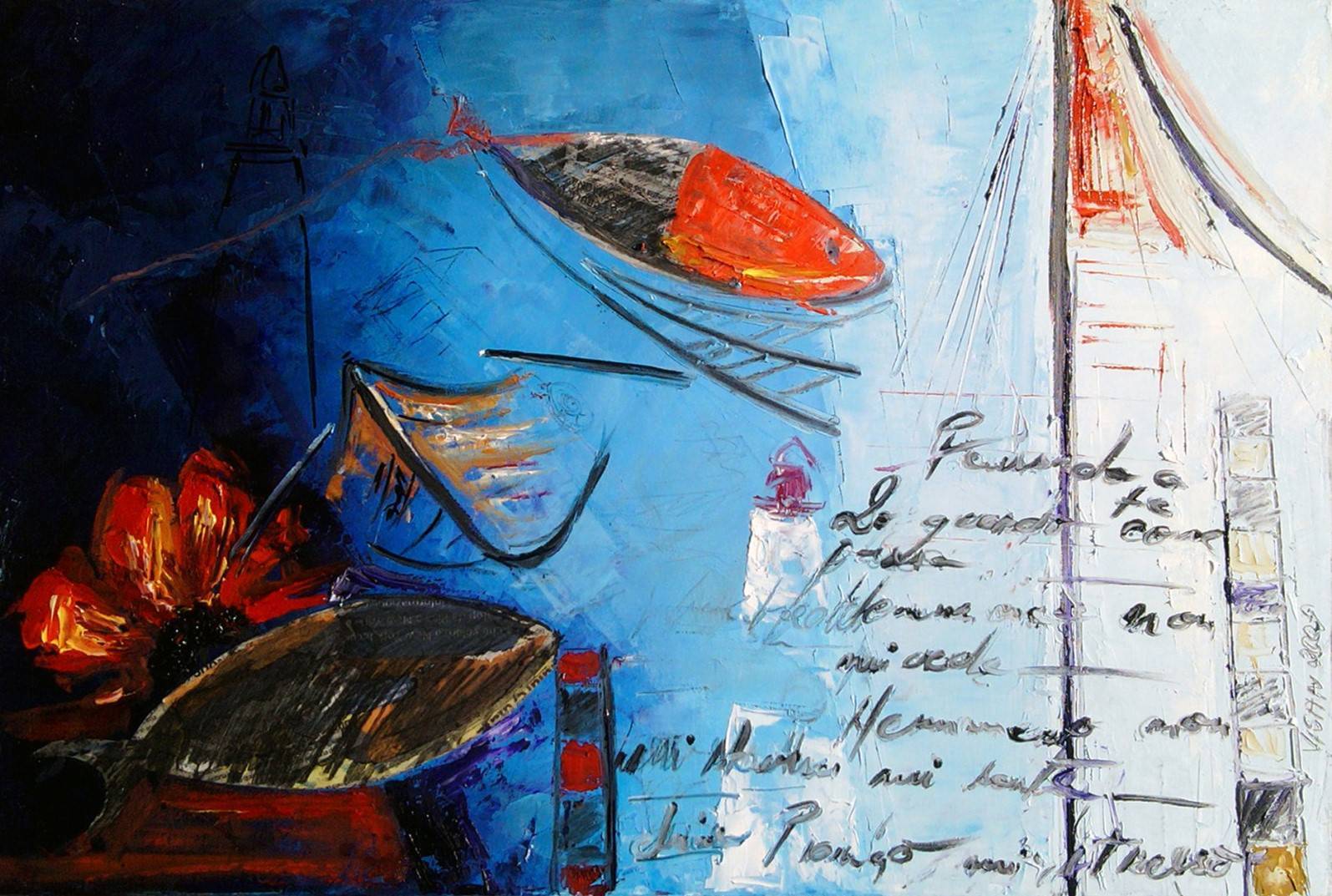 Na obrazie dominuje kolor niebieski, tworząc tło pełne głębi i spokoju, jak niebo tuż przed zachodem słońca. Kompozycja jest dynamiczna, z mocnymi akcentami czerwieni i pomarańczu, które przyciągają wzrok w sam środek wszechobecnego błękitu. Ręka artysty z wprawą nakłada na płótno grube warstwy farby, nadając teksturę i wyrazistość. To prawdziwe "painter's touch". Atmosfera jest pełna tajemnicy, zachęcając do refleksji i interpretacji tego, co symbolizuje ta czerwona ryba unosząca się w przestrzeni. Styl obrazu jest nieco surrealistyczny, z nutą abstrakcji. Widać tu technikę impasto, która dodaje dramatyzmu i intensywności, jakby artysta chciał, żeby każda warstwa opowiadała swoją własną historię. Obraz emanuje emocjami, może wzbudzać uczucie zachwytu, ale i lekkiej niepewności – co autor miał na myśli? Dla siedmiolatka: "To tak jakby ryba latała w chmurach i bawiła się z kolorami". Każdy może zobaczyć w tym płótnie coś innego, coś osobistego. Dla mnie to podróż w głąb wyobraźni, gdzie zderzają się marzenia. Tutaj nie ma końca wędrówki, tylko nieustająca eksploracja nieznanego, która wciąga i nie pozwala się oderwać.