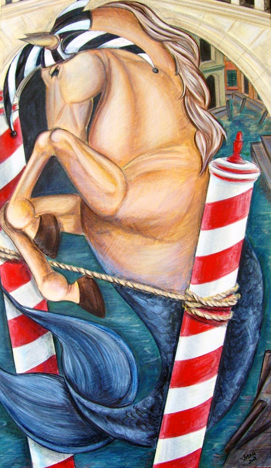 Obraz przedstawia niezwykłe połączenie konia i ryby, tworząc fascynującą hybrydę. Dominują tu odcienie błękitu i ciepłe brązy, które nadają kompozycji harmonii. Turla się tu pewna energia, coś magical, jak z bajki. Zwierzę, z ozdobioną kolorami grzywą i płetwą o eleganckich łukach, pływa wśród biało-czerwonych słupków, które przypominają błyski morskich latarni. Istnieje tu kontrast pomiędzy spokojem wody a dynamiczną postawą stworzenia. Atmosfera jest pełna tajemnicy i niezwykłości, a może też odrobinę beztroski. Artystycznie obraz nawiązuje do surrealizmu. Artysta bawi się formą i proporcją, kreując coś zupełnie nieoczekiwanego. Kreski są płynne, co dodaje ruchu i płynności. Obraz może wywołać u odbiorcy wiele emocji. Dla mnie jest pełny inspiracji i trochę zamieszania - jak połączenie snu z rzeczywistością. Patrząc na ten obraz, czuję jakbym odpływał, odkrywając nowe światy. To właśnie takie prace sprawiają, że sztuka jest czymś więcej niż tylko wizją. Jest o rzeczach, które wydają się niemożliwe, ale w tym wszystkim tak piękne. A mój brat powiedziałby, że to konik morski jedzie na przygodę.