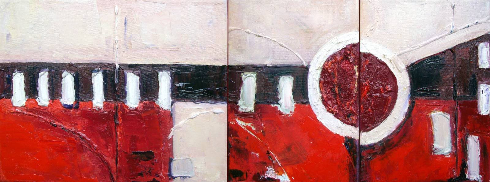 Obraz emanuje energetyczną mieszanką czerwieni i pastelowych odcieni, tworząc dynamiczną kompozycję, która przyciąga wzrok. Czerwień płynie po płótnie niczym rzeka, kontrastując z bielą i ciemniejszymi plamami czerni. Duże, pionowe kształty nawiązują do architektonicznych form, nadając całości rytmiczny, niemal muzyczny charakter. Obraz wygląda jakby był podzielony na trzy części, co dodaje mu głębi i złożoności. Nastrój dzieła jest pełen napięcia i dramatyzmu, jakby artysta chciał oddać chaos i zinstensyfikowane emocje. Stosując impasto, artysta tworzy tekstury, które dodają obrazu cielesności i trójwymiarowości. Technika ta sprawia, że praca wydaje się niemalże materialna, gotowa wyjść poza ramy. Obraz może wywoływać różnorodne emocje. Dla jednych to eksplozja energii, dla innych coś zdecydowanie bardziej melancholijnego. Widząc to, czuję jakby fala passion ogarnia moje zmysły. Dzieło przypomina mi chaos dnia codziennego, gdzie przenikają się różne elementy życia. "To jak wielki soczek z czerwonych kolorów!" – powiedziałby 7-latek patrzący na to dzieło. Obraz wciąga i hipnotyzuje, przypominając, że czasem warto zatrzymać się i zanurzyć w intensywności chwili. م