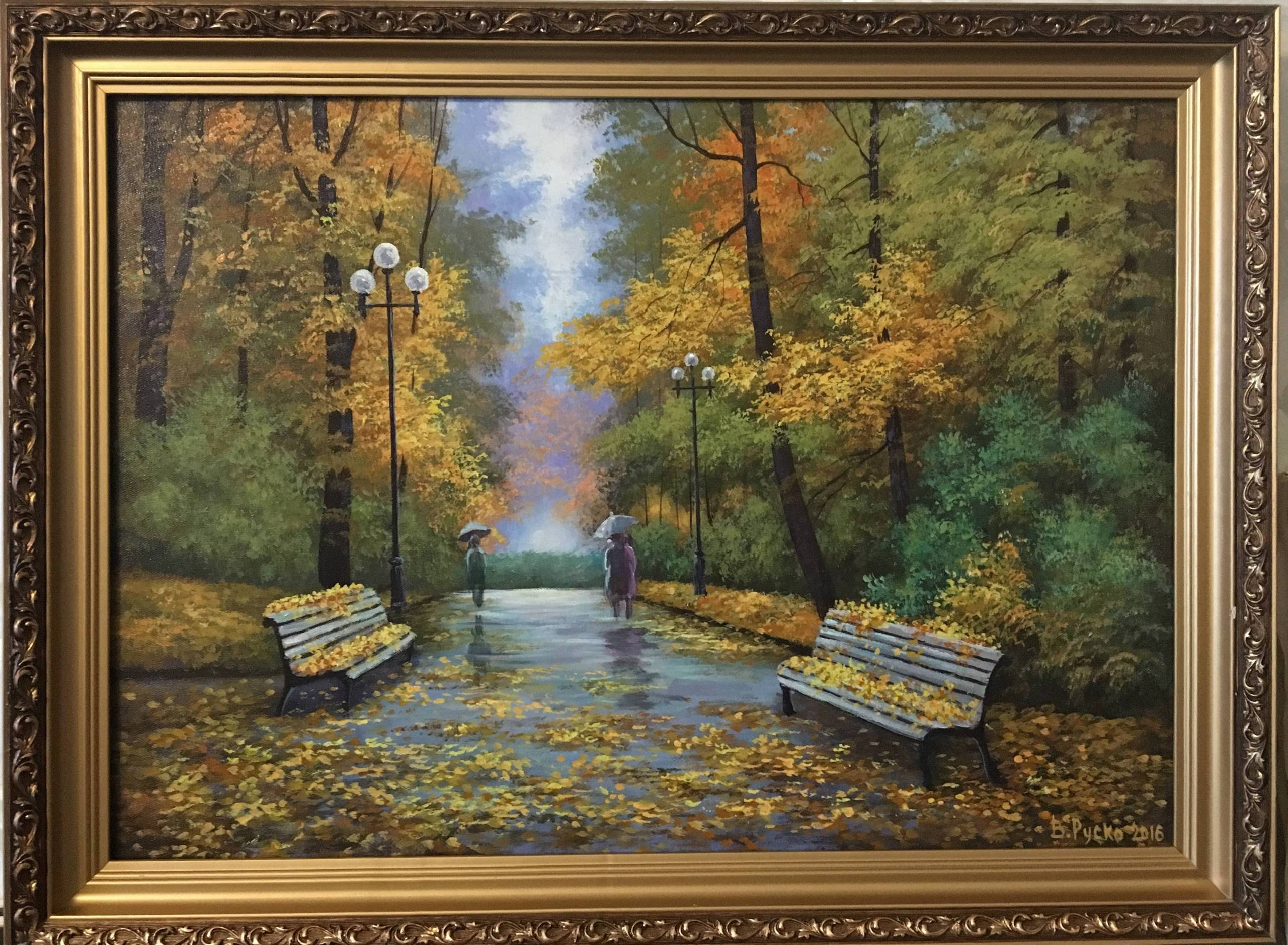 Obraz przedstawia malowniczy jesienny pejzaż parku. Dominują tu złote, żółte i pomarańczowe tony liści, które opadły na ścieżkę oraz ławki. Wszystko to zostało otoczone soczystą zielenią drzew. Centralnym punktem kompozycji jest mokra aleja, odbijająca światło i tworząca efekt lustrzanego odbicia. W oddali widoczne są postacie z parasolami, które dodają życia temu spokojnemu krajobrazowi. Nastrój obrazu jest nostalgicznym, niemal magicznym zatrzymaniem chwili w czasie jesiennego spaceru. Dominują tu spokój i sielskość, ale czuć też ulotność tego momentu. Artysta posłużył się realistycznym stylem z subtelną nutą impresjonizmu. Widoczne są delikatne pociągnięcia pędzla, które nadają teksturę liściom i chmurom. Dla mnie ten obraz jest jak magiczne miejsce w książce, gdzie wszystko jest "super pretty" i można spacerować wiecznie. It's like stepping into a dream. Każda osoba może poczuć różne emocje patrząc na ten obraz – od relaksu po refleksje nad przemijaniem czasu. A ja bym chciała tam popływać w kałużach!