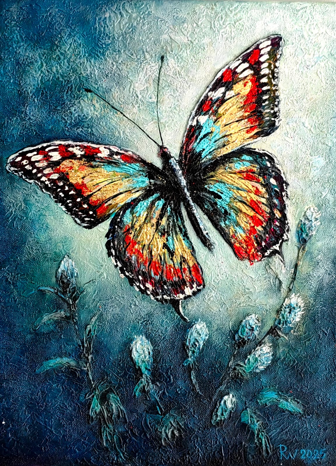 Na obrazie widzimy barwnego motyla unoszącego się nad delikatnymi gałązkami kwiatów. Skrzydła owada pulsują odcieniami niebieskiego, czerwonego i żółtego, kontrastując z subtelnym, turkusowym tłem. Czuć, jakby motyl lada moment miał opuścić płótno i wzlecieć w niebo. Faktura obrazu jest bogata i szorstka, co dodaje dziełu głębi. Nastrój tej pracy jest pełen spokoju i tajemnicy, jakbyśmy mieli do czynienia z magicznym momentem natury. Wydaje się, że artysta użył techniki impasto, nanosząc farbę grubymi pociągnięciami, przez co każdy szczegół jest wyraźny i niemal trójwymiarowy. Obraz może wywoływać różnorodne emocje, od zachwytu nad pięknem natury po refleksję nad jej kruchością. Dzieci powiedziałoby – "Motyl jest taki duży jak mój dłoni!". Całość emanuje urokiem i finezją, pozostawiając widza w stanie lekkiego uniesienia, jakby chciało się powiedzieć: "Wow! This is beautiful." Dzieło zachęca do zatrzymania się, docenienia chwil. Kompozycja jest prosta, ale niezwykle efektowna, przypominając o delikatnym pięknie otaczającego nas świata.
