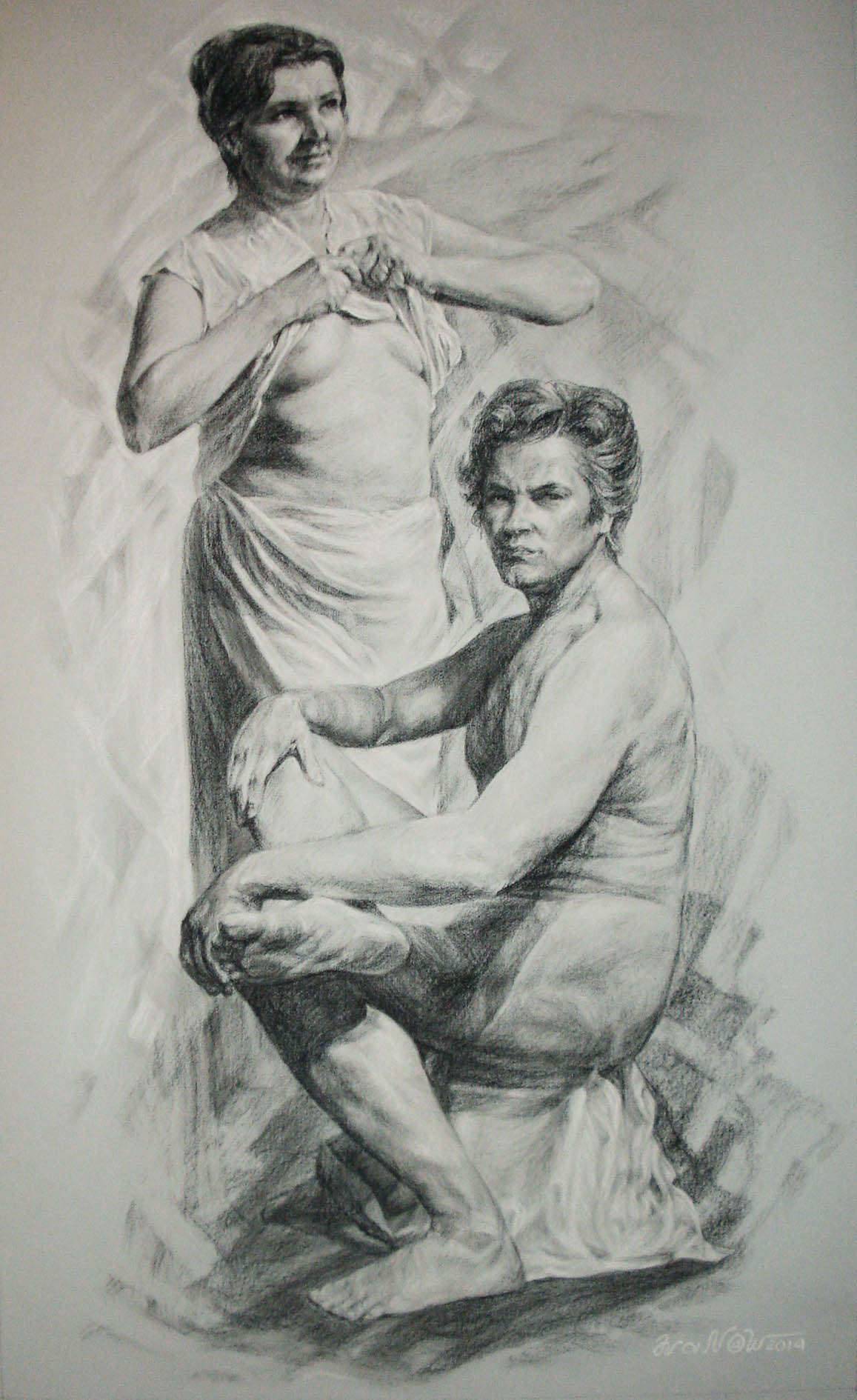 Na obrazie dominuje subtelna gama odcieni szarości, kompozycja zbudowana jest z dwóch postaci – siedzącej i stojącej. Postacie wykonane są w technice szkicowej, z naciskiem na detale anatomiczne i wyraziste kontury. Tło jest rozmyte, co dodatkowo podkreśla centralne umieszczenie postaci. Nastrój dzieła jest spokojny i nieco nostalgiczny. Można niemal poczuć ciszę, która otacza postacie. Artysta zastosował klasyczną technikę rysunku ołówkiem, z mistrzowską kontrolą kreski i cienia. Rysunek emanuje poczuciem intymności i introspekcji. Emocje, jakie można odczuć, patrząc na ten obraz, to mieszanka podziwu i zadumy. Zastanawiasz się, kim są te osoby, jaka historia kryje się za ich spojrzeniami. Można by rzec, że mają jakiś "mystery" w sobie, co przyciąga i intryguje. Mały chłopiec mógłby powiedzieć: "Oni wyglądają jak bohaterowie bajki!" I rzeczywiście, jest w nich coś niezwykłego, coś co sprawia, że patrzysz dłużej, zatrzymujesz się, by zrozumieć. Czuć, że artysta miał głęboki szacunek do swoich modeli, iż starał się uchwycić ich esencję. Myśli krążą wokół tematów przemijania i piękna ludzkiej formy.