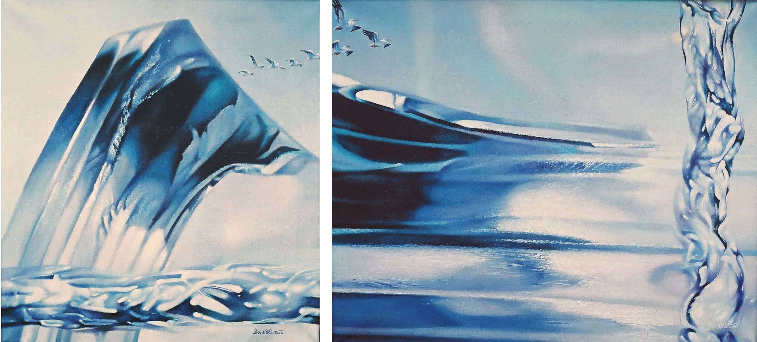 Obraz urzeka delikatną paletą błękitów i bieli, które dominują całą kompozycję. Przypomina mi lodowiec, choć to zdecydowanie bardziej abstrakcyjna wizja. Na pierwszym planie widać jakby lodowe fale, które zdają się płynąć jednym rytmem z ptakami szybującymi w tle. Ich skrzydła dodają dynamiki. Atmosfera wydaje się chłodna, ale jednocześnie uspokajająca. Artysta używa techniki, która przypomina airbrushing, dając efekt soft transition między tonami. Całość wygląda jak nieziemski pejzaż. To dzieło może wywołać u odbiorcy poczucie spokoju, może nawet trochę melancholii. Może też ktoś poczuje się jakby obserwował, jak świat zamarza. „It's so peaceful” przyszło mi na myśl. A dziecko powiedziałoby, że to miejsce, gdzie mieszkają przyjacielskie, lodowe smoki. Obraz skłania do refleksji i zachwytu nad subtelnością natury i jej nieskończoną urodą. Fascynujące, jak artysta potrafi uchwycić coś tak nieuchwytnego.