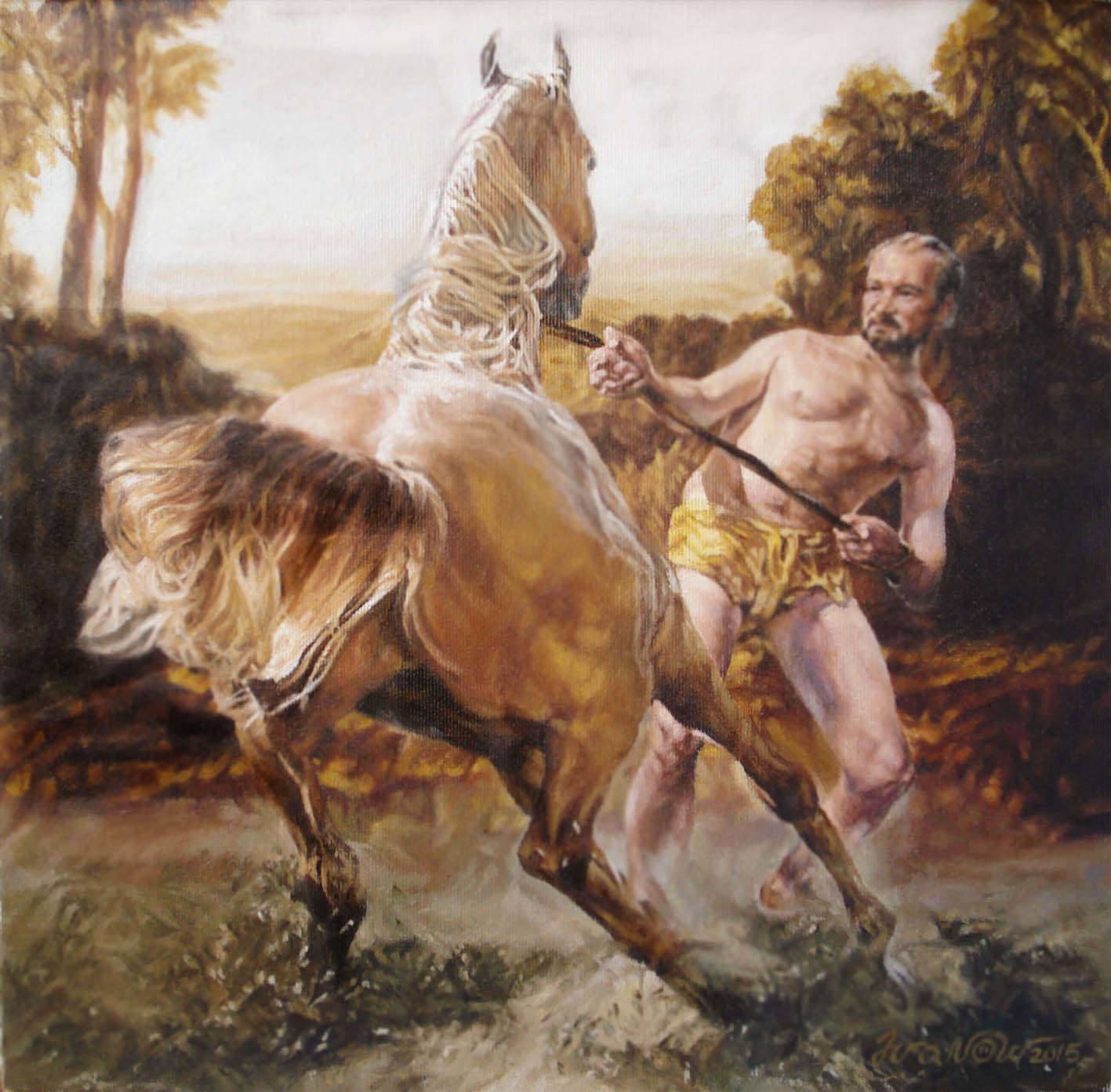 Obraz przedstawia dramatyczną scenę spotkania człowieka i konia, w której energia i dynamika wręcz biją z płótna. Dominują ciepłe odcienie brązu i złota, które nadają dziełu przyjemnie antyczny charakter. Człowiek ubrany w jasne szaty zdaje się z ogromną siłą starać zapanować nad potężnym zwierzęciem. Koń ma bujną grzywę rozwiewającą się na wietrze, a jego ciało zdaje się wręcz pulsować życiem i niesfornością. Atmosfera napięcia jest niemal namacalna; odbiorca czuje się, jakby sam uczestniczył w tej intensywnej chwili. Obraz wydaje się namalowany techniką olejną, z dbałością o detale, takie jak mięśnie konia czy mimika człowieka. Artysta zgrabnie bawi się światłem i cieniem, dodając scenie głębi. Styl jest realistyczny, ale nieco romantyczny, co sprawia, że odbiorca może się zatracić w tej chwili zatrzymanej w czasie. Emocje wrą. Można poczuć napięcie i determinację, harmonię człowieka z naturą, a może też skrywaną dzikość. Sądzę, że ktoś mógłby stwierdzić, iż to walka między naturą a cywilizacją, pełna sprzeczności i pytanie. Kogo słuchać, serca czy głowy? Wow, to jest prawie jak z filmu przygodowego, ale na obrazie. "The struggle is real", powiedziałby ktoś myśląc o wyzwaniach codzienności. Dziecko mogłoby powiedzieć, że pan bawi się z konikiem, i w tym też coś jest - dziecinna prostota dostrzegająca zabawę tam, gdzie inni widzą konflikt.