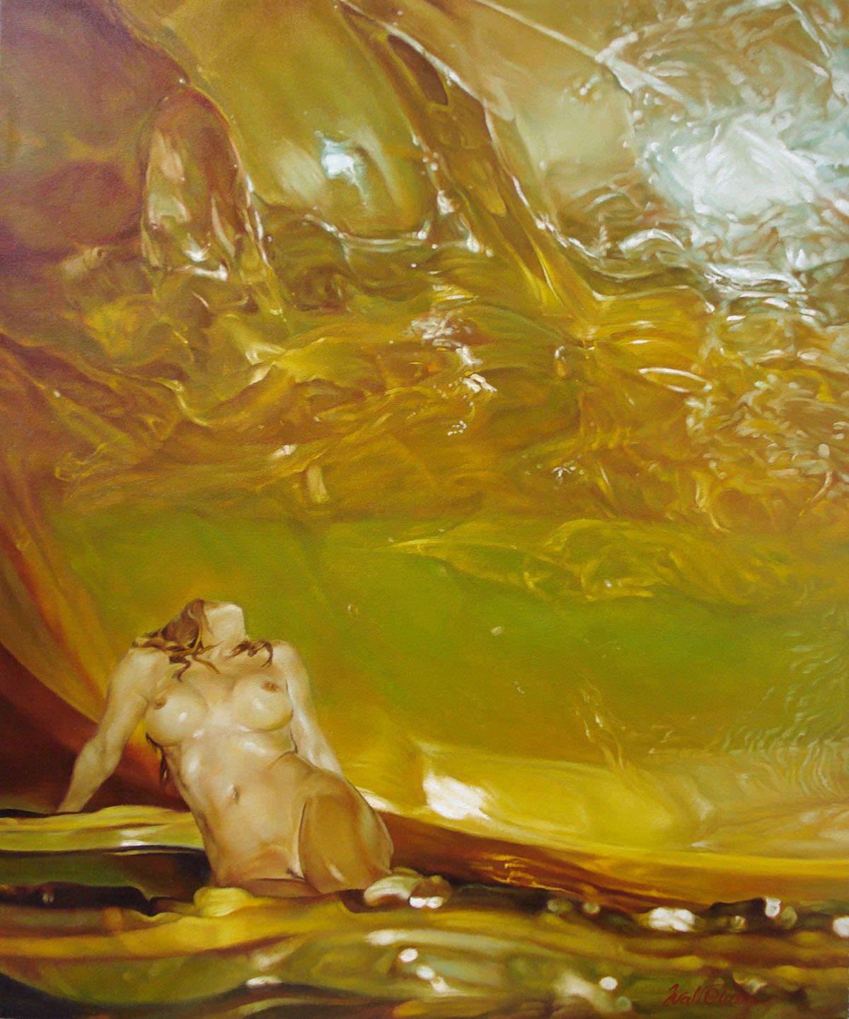 Obraz otacza nas burzą złota, ciepłych żółci i sepii. Wygląda na to, że postać wykuta w kamieniu, nagle uległa delikatnemu rozpuszczeniu, wtapiając się w otoczenie jak wosk pod gorącym słońcem. Kompozycja jest interesująca – figura zajmuje dolny lewy róg, a reszta płótna pochłania ją niczym ocean pełen dynamicznych fal kolorów. Światło tańczy po powierzchni, przyciągając wzrok ku centrum malowidła. Ale czy to miejsce jest prawdziwe? A może to tylko sen? Atmosfera zdaje się być jednocześnie spokojna i niepokojąca, jakby coś wisi w powietrzu. Może tajemnicza opowieść. Nadrealizm tej sceny przywodzi na myśl prace Dalí'ego – surreality in its fullest form. Użycie grubej, dynamicznej faktury sprawia, że obraz niemalże pulsuje jak żywy organizm. Emocje, jakie wywołuje ten obraz, przypominają mi letnie popołudnia, kiedy czas płynie wolniej. Wygląda trochę jak bajka, którą można by opowiedzieć dziecku. Patrząc na tę artystyczną kreację, można zanurzyć się w refleksjach o naturze ludzkiej kruchości i pięknie. Tak jakby ten obraz mówił: „Znajdź swoją harmonię w chaosie świata.” Jest coś nieuchwytnego w sposobie, w jaki artysta użył barw, aby stworzyć wrażenie nieskończoności i zastanawiające, czy to perspektywa przejścia do innego wymiaru.