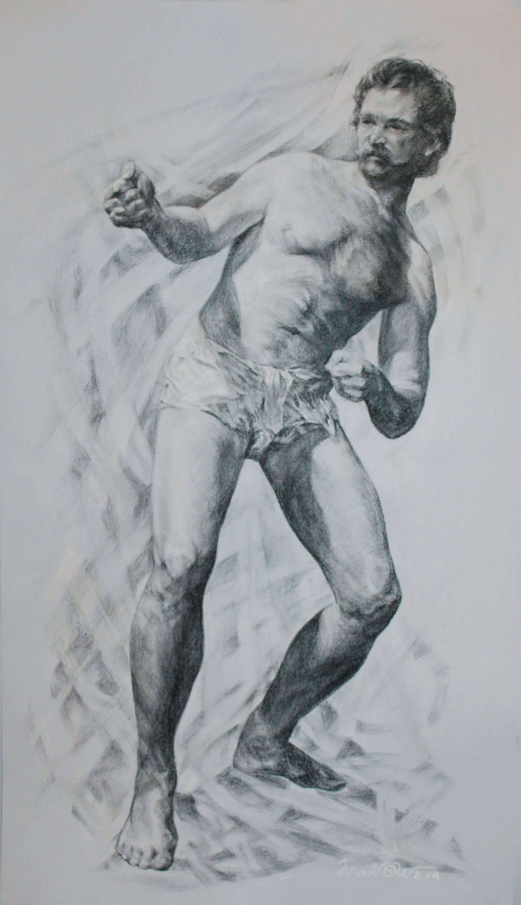 Na obrazie widzimy dynamiczną sylwetkę mężczyzny, uchwyconą w trakcie ruchu. Rysunek, wykonany w technice ołówka, emanuje surowością i prostotą. Drużyna szarości i bieli, tworzących obraz, nadaje całości nieco nostalgiczny klimat. Ciało postaci jest muskularne, a każdy mięsień wyraźnie zarysowany, dodając dynamizmu i siły. Tło, wyraźnie rozmyte, sprawia, że cała uwaga skupia się na centralnej postaci. Wygląda to trochę jak teatr cieni, gdzie jedyną postacią na scenie jest mężczyzna w bokserskiej pozie. Ta scena ma w sobie coś z oldschoolowego klimatu, jakbyśmy przeglądali stare fotografie w czarno-białych odcieniach. Styl tego dzieła przypomina klasyczną rzeźbę przeniesioną na papier. Artysta z wprawą użył techniki światłocienia, by wprowadzić wrażenie trójwymiarowości. Obraz emanuje siłą i zdeterminowaniem, co może skłonić widza do refleksji nad walką i wytrwałością. "Wow, on jest silny!" − powiedziałby zachwycony dzieciak. Patrząc na ten obraz, czuć napięcie, jakby czas zatrzymał się na moment walki. To drawing wciąga w swój mały świat pełen historii i emocji.