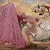 Na obrazie widzimy postać kobiety leżącej na trawie. Dominują ciepłe, pastelowe barwy, a centralnym punktem jest różowa spódnica pokryta drobnymi kropkami. W tle widoczne są rozmyte plamy, przypominające zamglony krajobraz, który nadaje obrazowi dreamlike aurę. Kobieta wydaje się być w stanie spokojnej refleksji, co potęguje poczucie intymności. Styl artysty jest nieco surrealistyczny, z wydłużonymi proporcjami postaci, co dodaje całości nieco bajkowego klimatu. Technika wydaje się oparta na delikatnym pociągnięciu pędzla, które subtelnie miesza kolory. Atmosfera na obrazie jest cicha, niemal szeptana. Wywołuje uczucie spokoju i zadumy. Może skłaniać widza do zastanowienia się nad momentami zatrzymania w codziennym pędzie. Czy nie jest to jak magiczna chwila z dzieciństwa, gdy leżeliśmy na trawie i marzyliśmy, co? Widoczne na twarzy kobiety delikatne zadowolenie sugeruje pogodzenie się ze sobą i światem. Ta scena sprawia, że czuję, jakby czas się zatrzymał, pozwalając na chwilę głębszej refleksji. It’s like a gentle reminder of life’s simple pleasures.