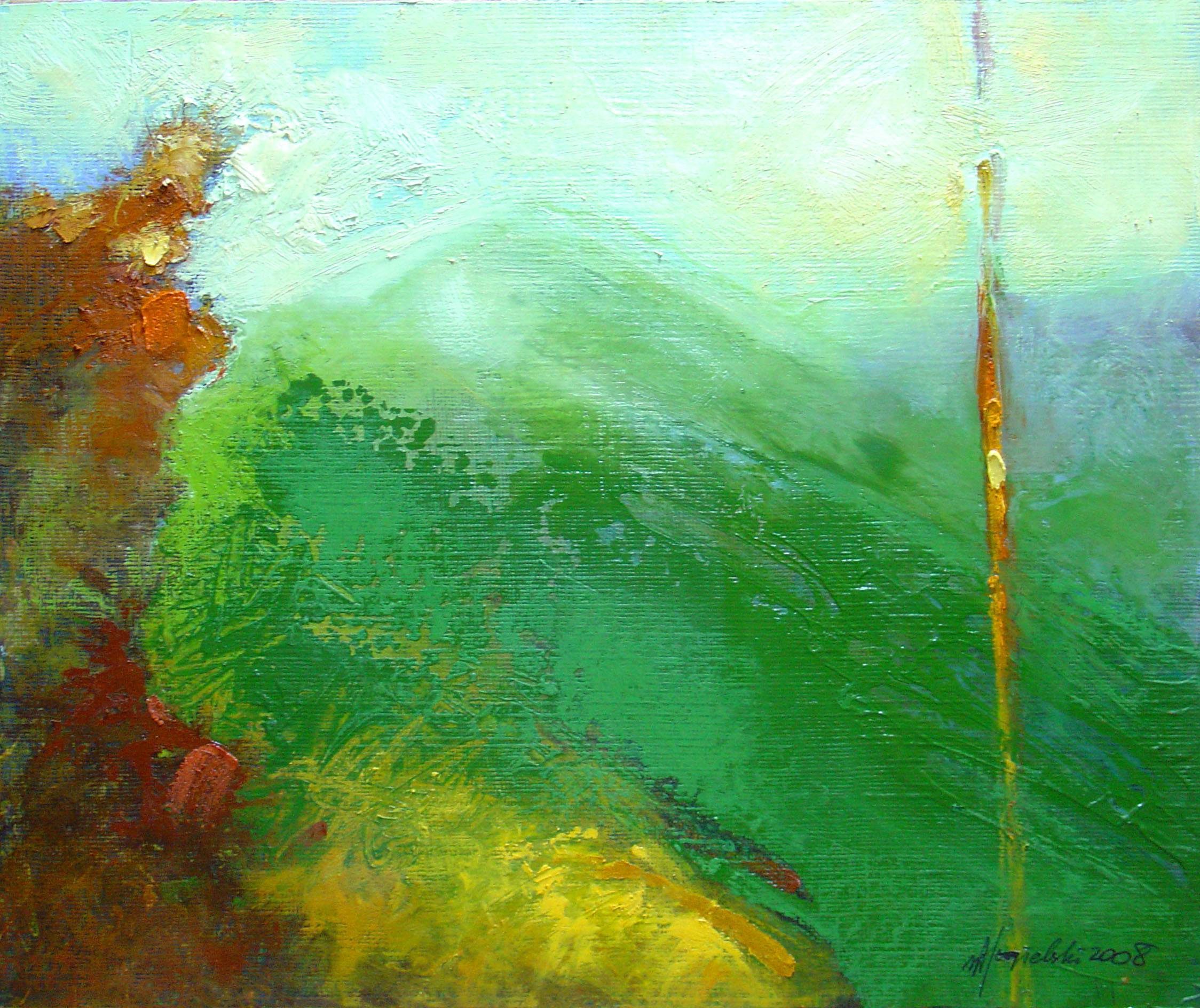 Obraz tętni kolorami zieleni, brązu i żółci. Widać tu dynamiczne pociągnięcia pędzla, które tworzą nieco abstrakcyjny, ale jednocześnie spójny krajobraz. Zielone odcienie dominują, oddając wrażenie bujnej natury. Po lewej stronie równoważy je energetyczny akcent brązu, który przypomina o jesiennej nostalgii. Kształty są nieregularne, lekko zacierają się, jakby wszystko było delikatnie rozmyte. Obraz emanuje spokojem, ale zarazem tajemnicą. Można poczuć jakby wiatr muskał policzki. Jakby ktoś szeptał: "Chodź, odkryj mnie." Styl malarski to impresja z nutą abstrakcji, skrząca się odważnym zastosowaniem tekstur i kolorów. Patrząc na to dzieło, człowiek może zatopić się w refleksji, poczuć chwilę oddechu od zgiełku dnia codziennego. Obraz jest taki... jakby mówił: take a break, enjoy the view. Może wywołać uśmiech, zaciekawienie, a u niektórych pewnie i tęsknotę za przyrodą. To jak patrzenie przez magiczne okno do innego, zielonego świata. A gdyby spytać dziecka, powiedziałoby, że to "jak z bajki las, gdzie mieszkają krasnoludki." Coś w tym jest.