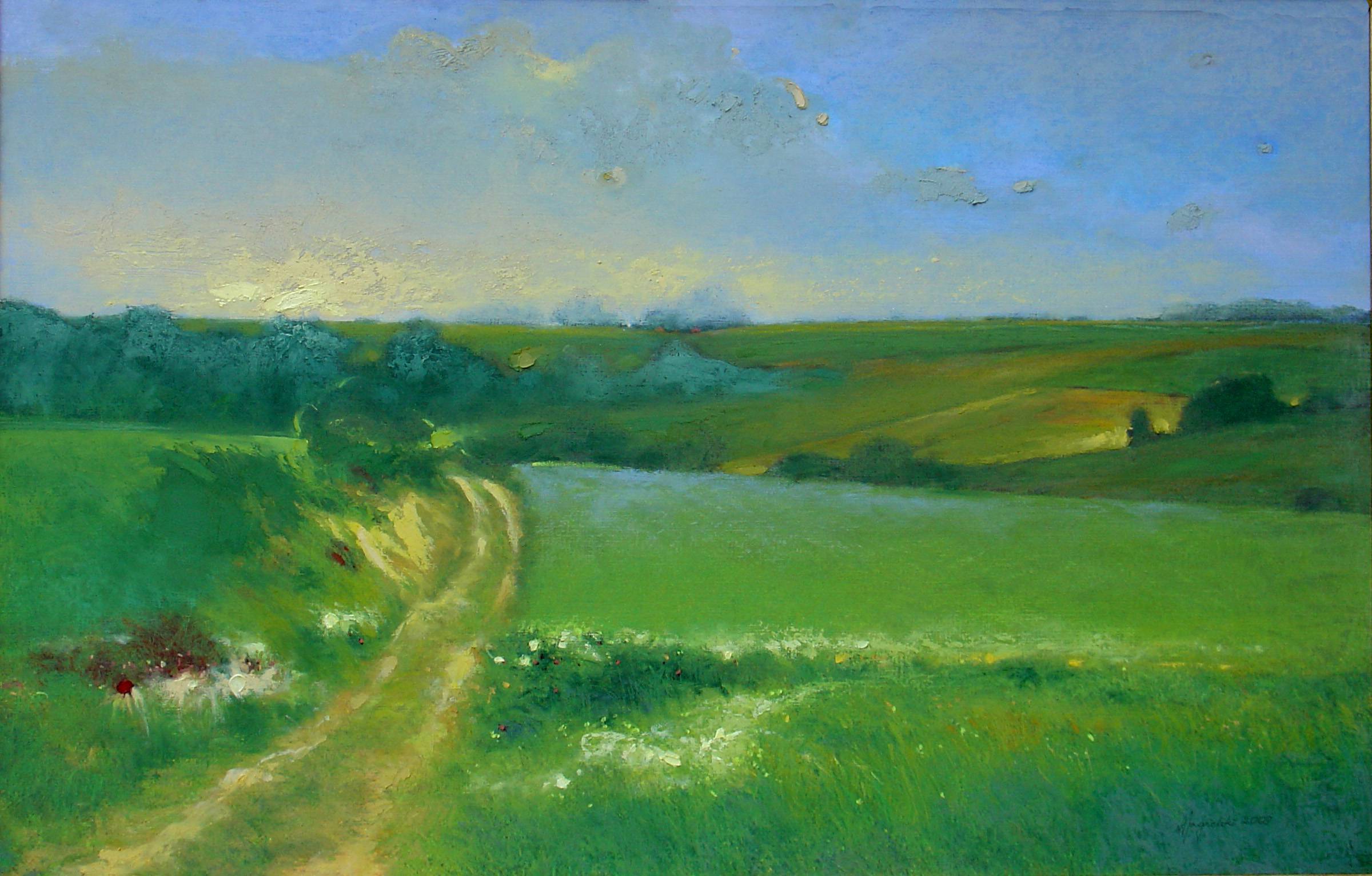 Obraz przedstawia rozległą, zieloną łąkę rozciągającą się po horyzont. Dominują odcienie zieleni, od jasnych do ciemniejszych, które pięknie kontrastują z błękitem nieba. W centralnej części widzimy piaszczystą ścieżkę wijącą się przez krajobraz, jakby zapraszała do spaceru i odkrywania. Chmury są delikatnie rozmazane, dodając subtelności kompozycji. Atmosfera obrazu jest spokojna i sielankowa, przypomina letnie popołudnie w countryside. Czuję się jak dziecko na wakacjach u babci! Styl artystyczny wskazuje na lekki impresjonizm, z miękkimi pociągnięciami pędzla i niewyraźnymi konturami. Dzieło emanuje uczuciem wolności i harmonii z naturą, sprawiając, że można zapomnieć o codziennych troskach. Techniki zastosowane przez artystę oddają subtelność światła, które migocze na łące. Obraz może wzbudzać nostalgiczne tęsknoty za prostotą życia poza miastem. Miracle! Patrząc na niego, czuję przypływ spokoju i refleksję nad własnym miejscem w świecie. To jest jak chwila zatrzymania w biegu życia, zapraszająca do chwili zadumy i kontemplacji piękna otaczającej nas przyrody.
