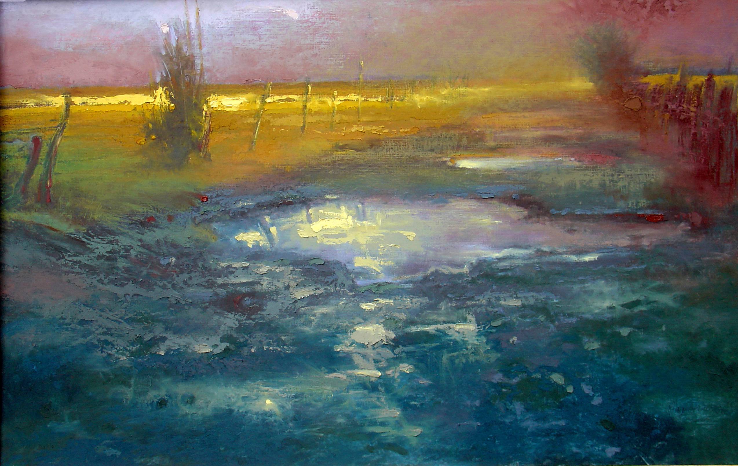 Obraz emanuje mistyczną aurą wschodu lub zachodu słońca, gdzie kolory ciepłe i zimne splecione są niczym taniec dwóch pór roku. Przede wszystkim zauważalny jest intensywny kontrast między złocistą żółcią a chłodnymi, niebieskimi tonami. Światło odbija się na błotnistym terenie, tworząc efekt lustra, który dodaje głębi tej malarskiej kompozycji. Linie są miękkie, a kontury rozmyte, co sprawia, że obraz tchnie delikatnością i tajemniczością. Artysta wykorzystuje technikę impasto, gdzie farba nakładana jest w grubej warstwie, co dodaje tekstury i trójwymiarowości. Ta technika, combined with dreamy colors, tworzy wrażenie tkliwości. Obraz może przywoływać uczucia nostalgii i tęsknoty za chwilami, które minęły lub nigdy się nie wydarzyły. Atmosfera jest spokojna i medytacyjna, zupełnie jak w momencie, gdy wszystko wokół nas się zatrzymuje. Dla mnie to miejsce, gdzie echa przeszłości spotykają się z marzeniami o przyszłości. W takich obrazach można się zanurzyć, by odnaleźć spokój. Naprawdę, to coś pięknego jak bajka, którą chciałoby się opowiadać na dobranoc. Można poczuć ciepło słońca na skórze, choć jest tylko iluzją pędzla na płótnie. A może nawet chcesz tam wskoczyć i zobaczyć, co kryje się za horyzontem.