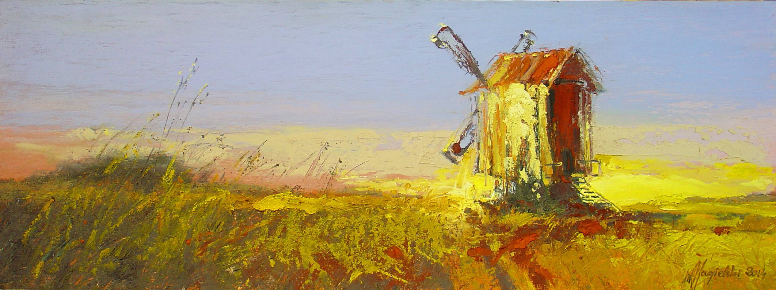 obraz przedstawia stary wiatrak w polu. Jest oprawiony i werniksowany