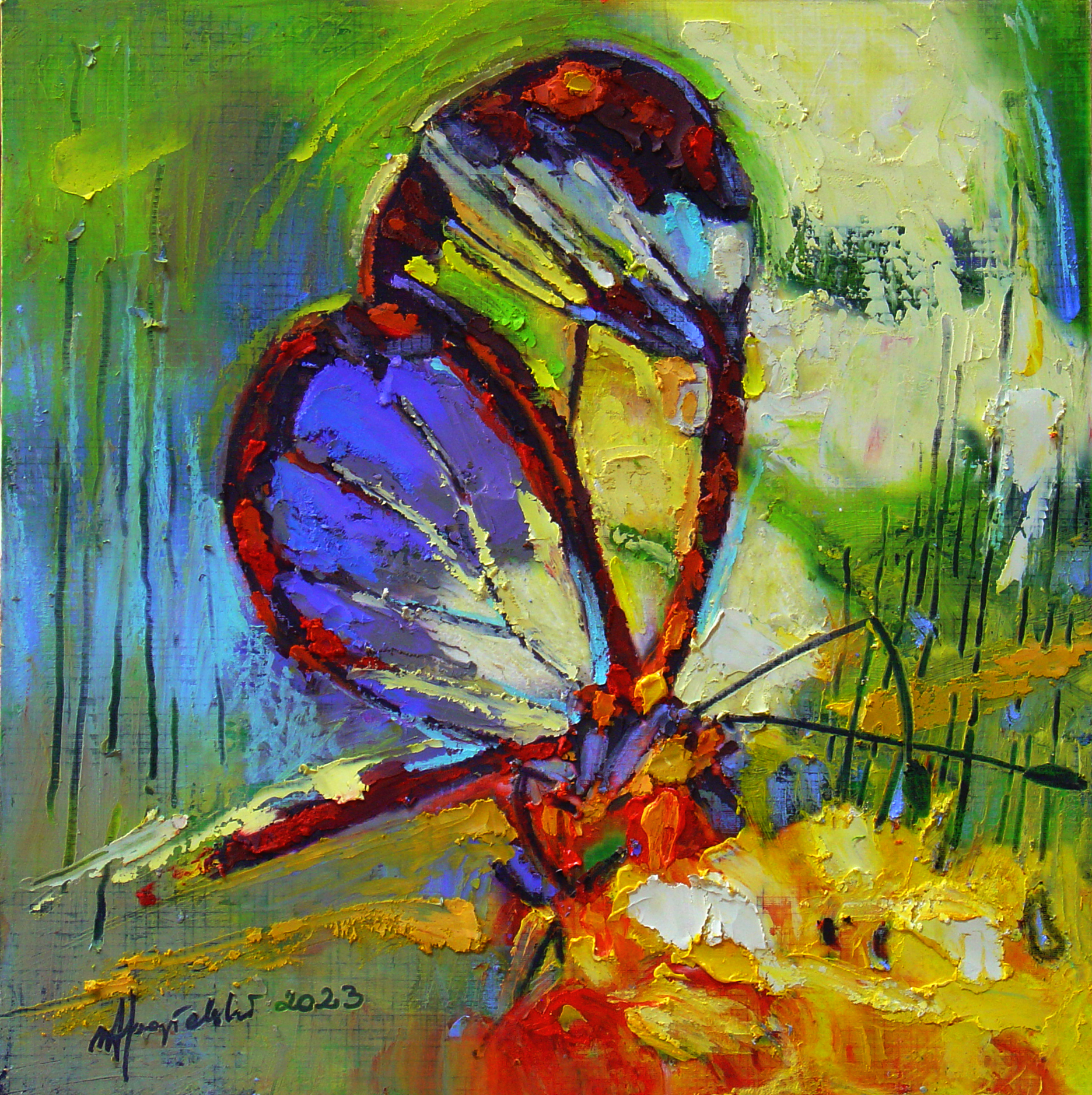 Obraz malowany na pilśni w technice olejnej ale wzbogaconej o własne techniki. Malowany impasto z dużymi strukturami gdyż farby olejne wzbogacam o dodatkowe pigmenty i plastyfikatory. Jest to obraz z cyklu "W moim ogrodzie" przedstawia jeden z wielu motyli, owadów malowany w tym samym formacie.