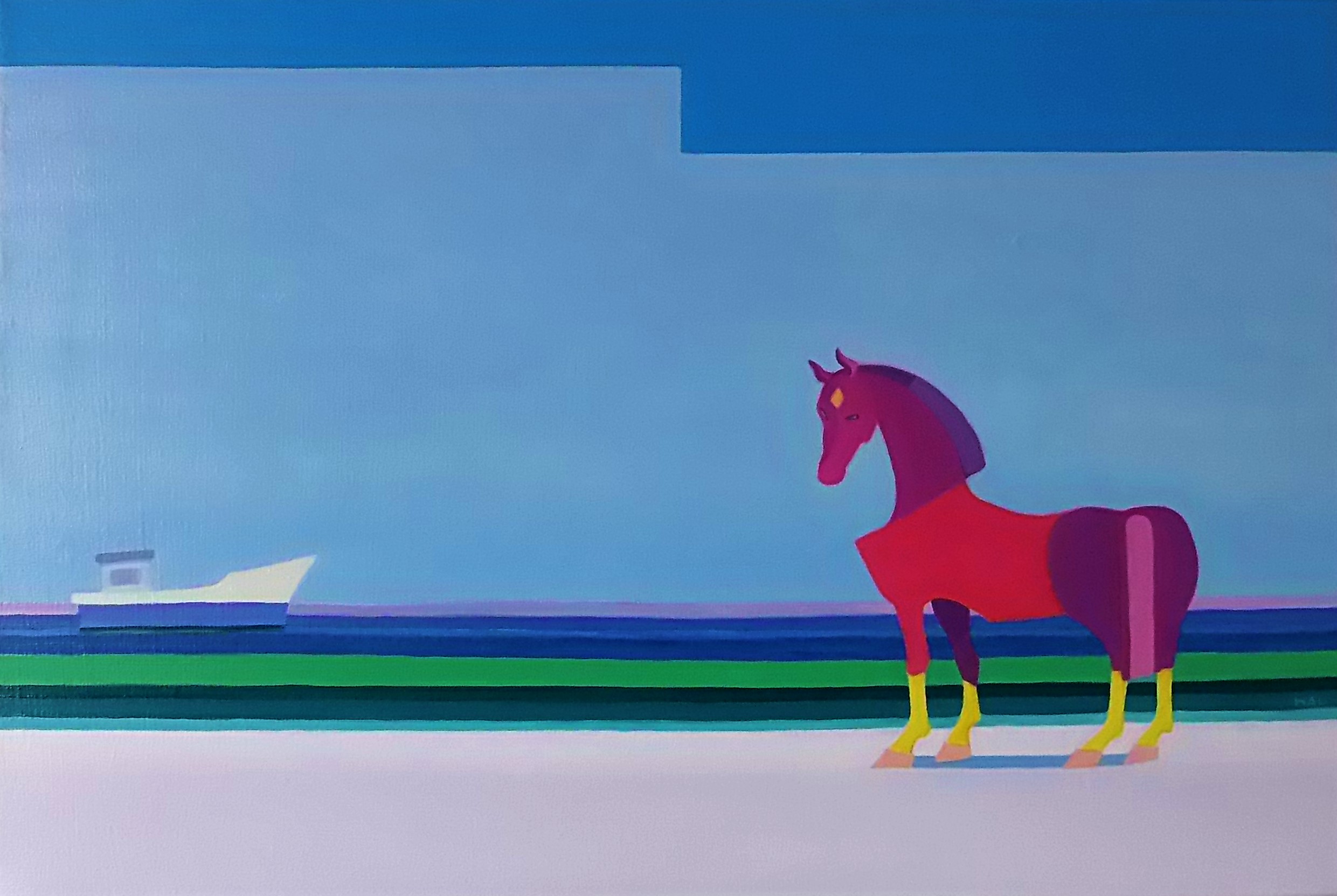 Na obrazie widzimy intensywnie kolorowego konia stojącego na tle spokojnego, błękitnego morza i błękitnego nieba. Koń jest pomalowany w odcieniach czerwieni i fioletu, z jaskrawo żółtymi nogami, co tworzy kontrast z pastelowym otoczeniem. Jego kształty są geometryczne, jakby wyrzeźbione z kartonów. Obok konia widnieje biały statek, który płynie powoli po horyzoncie. Statyczna kompozycja, proste linie oraz jednolite plamy barw tworzą wrażenie spokoju i bezruchu. Obraz wydaje się być przykładem pop artu, choć w nieco minimalistycznym stylu. Artysta zastosował płaskie, jednolite kolory, które nadają dziełu nowoczesny, świeży wygląd. Patrząc na ten obraz, można poczuć się jak dziecko na plaży, marzące o przygodzie wśród fal. Jest to zaskakująco fascynujące połączenie absolutnego spokoju z energią jaskrawych barw. "Why so serious?", chciałoby się zapytać. To, co najbardziej angażuje, to subtelna gra między rzeczywistością a abstrakcją. Kiedy na to patrzę, czuję lekkość i odprężenie. Jakby czas się zatrzymał na chwilę, dając przestrzeń do refleksji nad prostotą. Można by powiedzieć: koń na plaży to fajny widok! Obraz ten bawi się konwencjami, ukazując rzeczywistość w nietypowy, ale urzekający sposób.