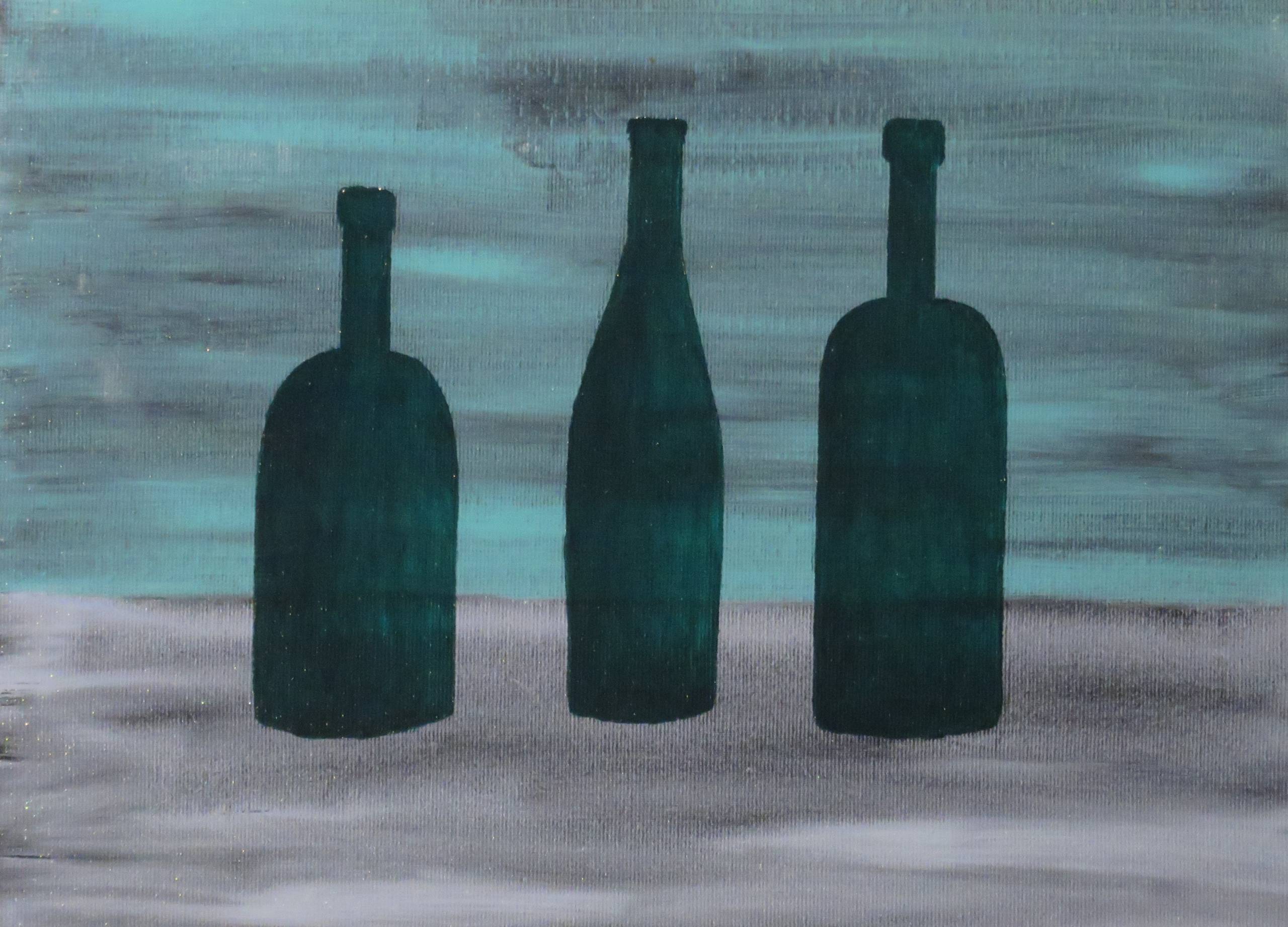 Obraz przedstawia trzy butelki, ułożone w równym szeregu na tle, które wygląda jak przydymione niebo. Dominujące kolory to odcienie szarości i melancholijnej zieleni, które przeplatają się w miarowej harmonii. Każda z butelek jest ciemna, niemal czarna, co tworzy kontrast z delikatnymi smugami tła. To trochę jak patrzenie na nocny krajobraz przez mglisty filtr. Nastrój dzieła jest tajemniczy i nieco nostalgiczny. Artysta zastosował delikatne pociągnięcia pędzla, które nadają obrazowi wyrafinowaną teksturę. Ciekawe, że prostota formy kryje w sobie głębszą refleksję nad przemijaniem lub pustką. Może ktoś się zastanawia, co wcześniej znajdowało się w tych butelkach. Moje dziecko powiedziałoby: „Hej, mamo, one wyglądają jak gigantyczne roboty!”. Tak, to może być też ciekawe spojrzenie. Użycie słowa „mysterious” idealnie oddaje atmosferę. Obraz prowokuje do osobistej refleksji i pozwala odbiorcy na chwilę zadumy nad tym, co niewidoczne. Zastanawiam się, czy artysta próbował uchwycić coś więcej niż tylko martwą naturę.