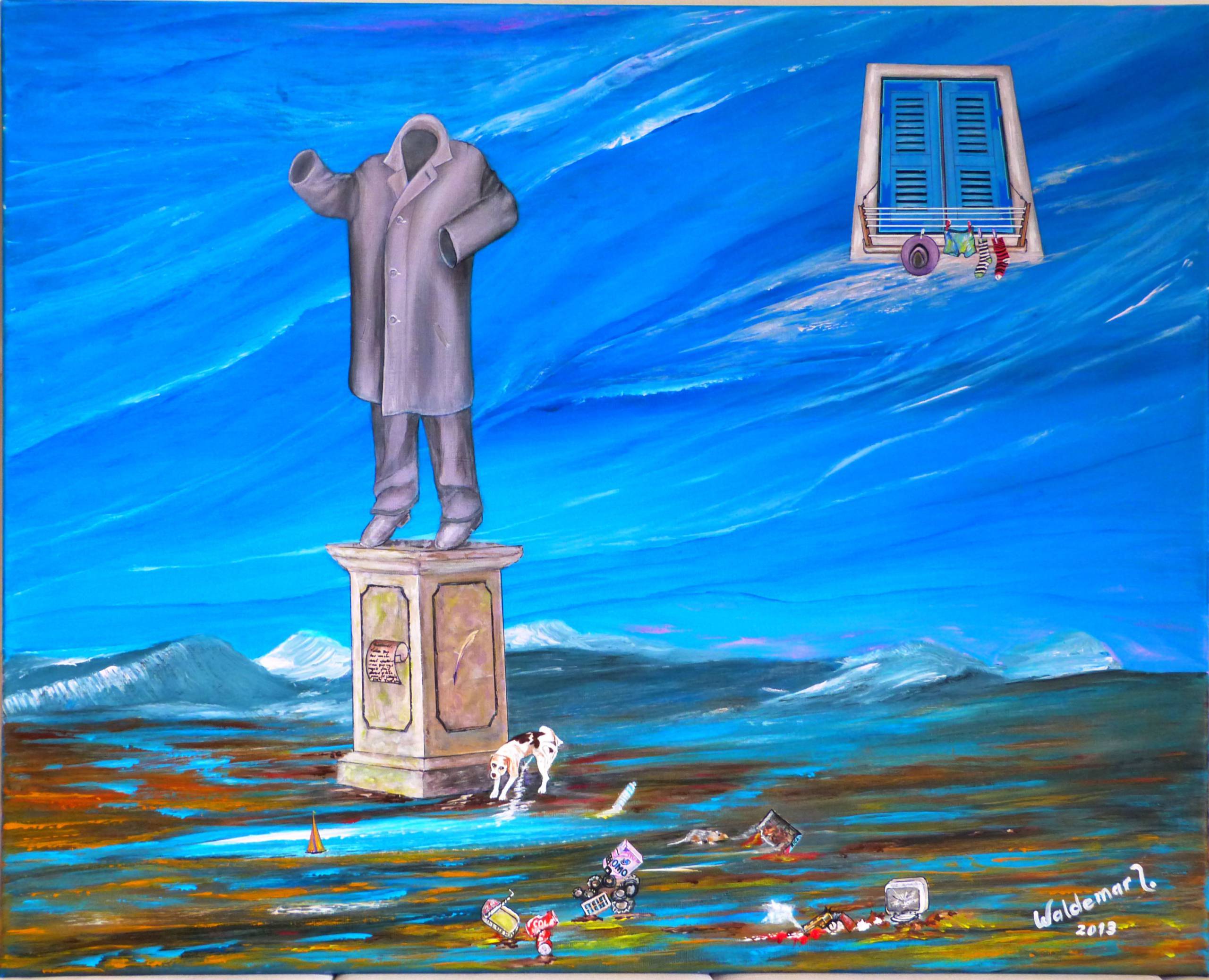 Obraz przedstawia surrealistyczny krajobraz o dominującym kolorze nieba, intensywnie błękitnym, skrzącym się w różnorodnych odcieniach. Centralnym punktem jest pusta marynarka na piedestale – jakby ktoś zdjął głowę i schował, zapominając o reszcie. Towarzyszy temu enigmatyczne okno z żaluzjami, zdecydowanie zamknięte, wiszące w powietrzu. Psia sylwetka na dole wzmacnia poczucie nierealności. Technika malarska przypomina nieco dzieła klasycznego surrealizmu z nutką post-modern twist. Przypomina mi się zdanie: to jest trochę jak sen, który się nie kończy. Malowanie zdaje się gryźć z rzeczywistością i jednocześnie ją wyśmiewać. Czy uczucie pustki? Zaskoczenia? Ten obraz może być o wszystkim i niczym. To trochę jak oglądanie filmu bez tytułu. Emocje płyną w różne strony. Wow, look at those colors – mówi dziecko we mnie. Niedosłowność wywołuje chęć interpretacji, zaczynamy się zastanawiać, jaki jest prawdziwy przekaz. Trochę to jak gra w poszukiwanie wskazówek, ale bez mapy. Czuć w tym pewną ironię, może nawet lekki dreszczyk niepokoju. To obraz, który każdy z nas może inaczej "poczuć".