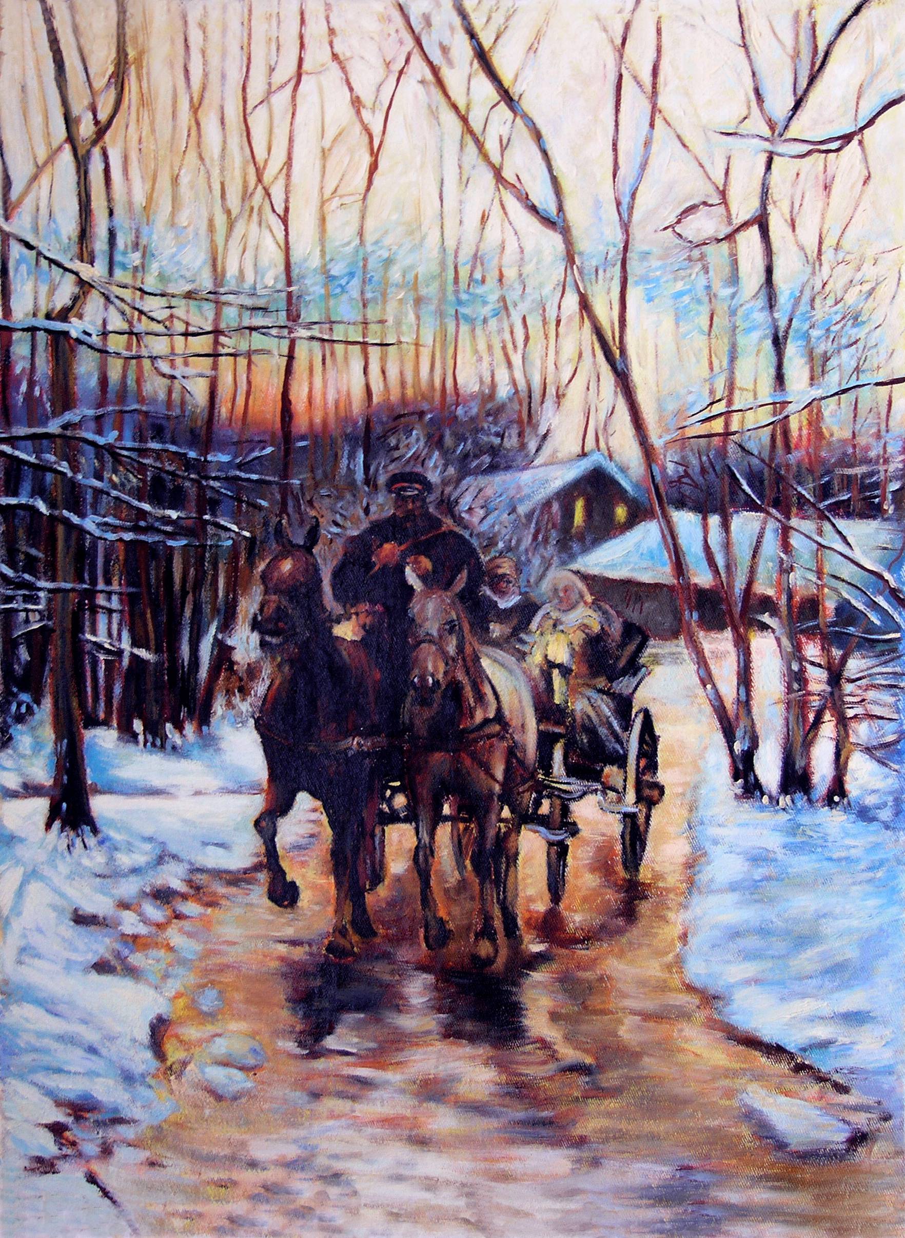 Na obrazie widać zimowy pejzaż z kolorami zimnego błękitu i ciepłych pomarańczy w tle zachodzącego słońca. Ślady kół w błocie prowadzą przez śnieżny krajobraz, rozweselony obecnością koni ciągnących sanie. W tle delikatnie zarysowane drzewa, jak smukłe smugi, rosną ku niebu, tworząc sieć cienkich gałęzi. Przestrzeń otaczają blade promienie słońca, które zdają się tańczyć na białej powierzchni ziemi. Kompozycja jest dynamiczna i harmonijna. Atmosfera emanuje spokojem i przytulnością, choć w centralnym punkcie widzimy roześmiane postacie, co nadaje obrazowi domowego ciepła. Malarską techniką charakteryzuje się swobodne pociągnięcie pędzla. To sprawia, że obraz jest pełen ruchu i życia. Wizualna symfonia zaprasza do zadumy nad wiejskim życiem. "The winter is coming" - krzyczałby ktoś z zachwytem, obserwując te serdeczne sceny. Ja myślę, że to jak pocztówka z lat dzieciństwa. Zdanie siedmiolatka mogłoby brzmieć: koniki są fajne. Ten obraz skłania mnie do zauważenia, jak proste chwile mogą być magiczne, pełne ciepła i uroku.