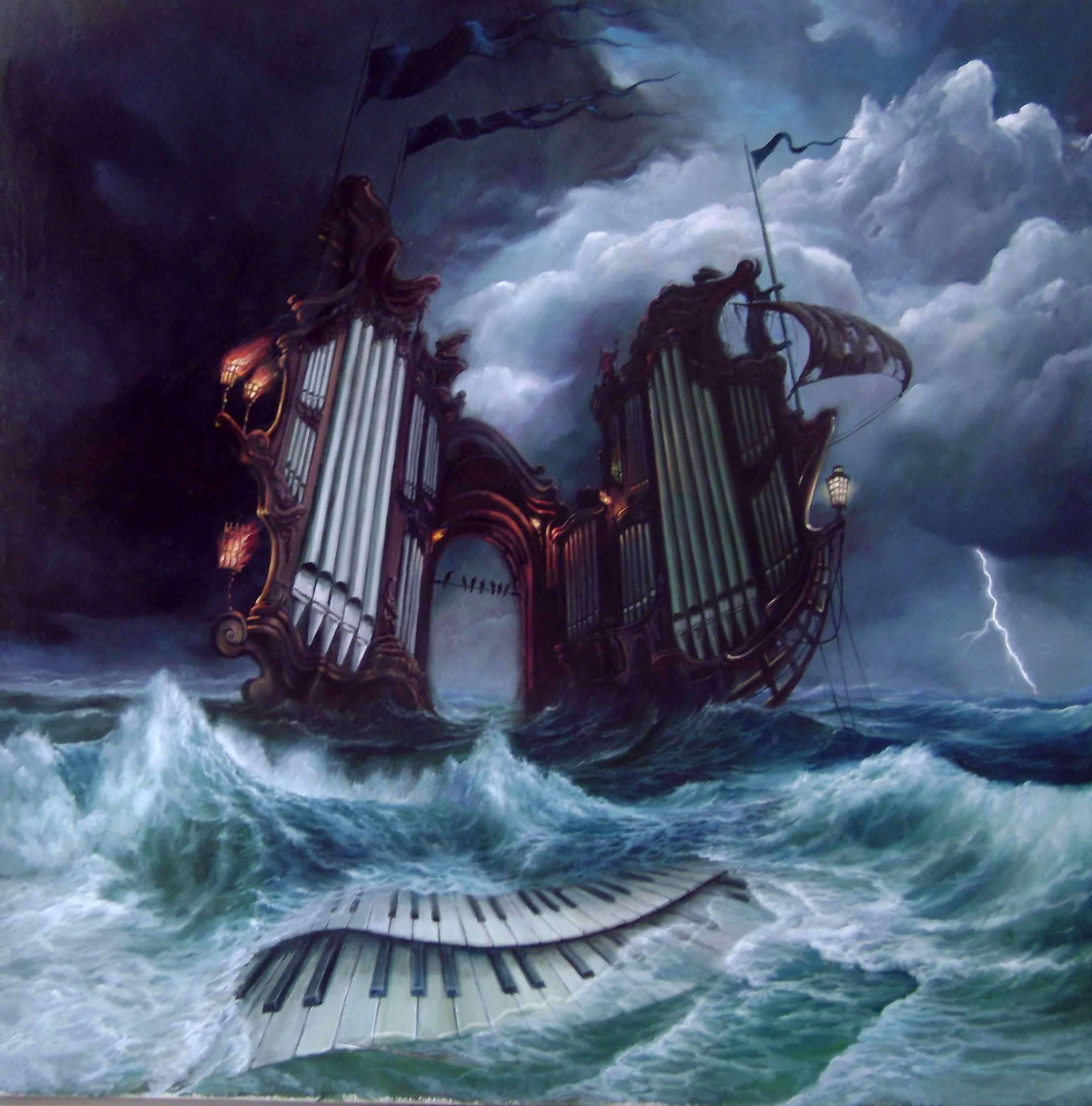 Na tym obrazie można dostrzec niezwykłą, surrealistyczną scenę burzliwego morza. W falach zanurzone są gigantyczne organy, które wyglądają jak statek unoszący się na wzburzonych wodach. Kolory są mroczne, dominuje głęboki granat i czerń, które przeplatają się z bielą piany morskiej i błyskawic rozświetlających niebo. To wszystko tworzy atmosferę grozy i tajemniczości. Artysta zastosował technikę realistycznego malowania, z dbałością o detale i kontrasty światła, co potęguje wrażenie dramatyzmu. Faktura morza została uchwycona z niezwykłą precyzją, dając wrażenie, jakby każda fala mogła za chwilę wyrwać się z obrazu. I co tutaj można jeszcze dodać? Jest trochę creepy, prawda? Obraz może wywoływać u oglądającego poczucie niepokoju, ale także fascynacji nieposkromioną siłą natury. Może to też być metafora dla życia pełnego wstrząsów, gdzie jedyną pewnością jest muzyka, która łączy świat chaosu z harmonią. Ten obraz jest jak "dream", gdzie zmysły odbierają nieoczywiste sygnały. Patrząc na to dzieło, można poczuć, jak emocje gniotą się w sercu, próbując rozgryźć, co artysta miał na myśli. "O, jaki piękny statek!" – mogłoby powiedzieć 7-letnie dziecko, zachwycone tajemniczością.