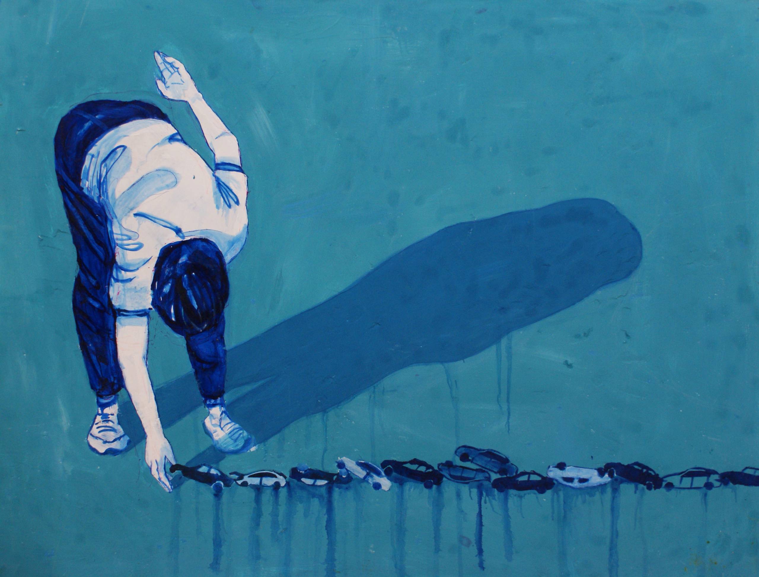Na obrazie widzimy postać pochylającą się nad rzędem miniaturowych autek. Dominują odcienie niebieskiego, a całość jest utrzymana w chłodnej kolorystyce. Jedno uderza w oczy: cienie, które są wyraziste i niezwykle wydłużone, nadając całej kompozycji fantastycznego klimatu. Tło jest jednolite, co podkreśla dramatyzm i znacząco zwraca uwagę na główny motyw. Technika, jaką posłużył się artysta, to prawdopodobnie akryl lub akwarela, co widać po miękkich, niemal rozmytych krawędziach. Prosty, wręcz minimalistyczny styl budzi wiele emocji. Może przypominać zabawę dzieci w piaskownicy. Mamo, mamo! Patrz, jak te autka fajnie się układają. Często takie obrazy budzą nostalgię, przypominając o dzieciństwie i niewinności. To uczucie lekkiej melancholii miesza się z nutką zadumy. There's something haunting about it, prawda? Obraz emanuje spokojem, ale jednocześnie prowokuje do refleksji nad ulotnością chwil.