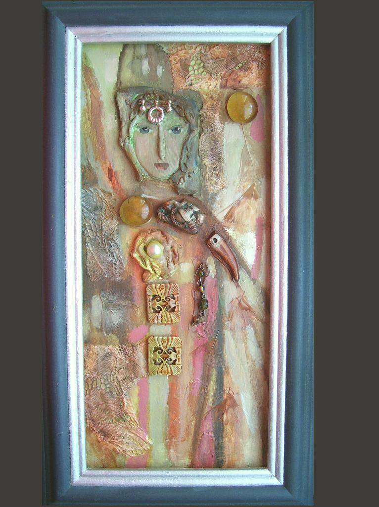 Obraz, który widzimy, wypełnia delikatna paleta barw. Pastelowe odcienie różu, beżu i złota przeplatają się, tworząc subtelną grę światła i cienia. Postać w centrum przypomina tajemniczą damę z dawnych czasów, z niebieskimi oczami, które zdają się wpatrywać prosto w nas. Kompozycja jest dynamiczna, choć jednocześnie emanuje spokojem. Elementy dekoracyjne, jak błyszczące klejnoty czy ozdobne płytki, dodają całości trójwymiarowości, co sprawia, że wydaje się, jakby figura za chwilę miała ożyć. Nastrój obrazu jest magiczny. Patrząc na niego, ma się wrażenie przeniesienia do innego wymiaru, gdzie czas płynie wolniej. Styl dzieła jest mieszanką surrealizmu i artystycznego kolażu. Technika warstwowego nakładania farb nadaje mu głębi. Obraz może wywołać różnorodne emocje. Dla niektórych będzie przypomnieniem minionych czasów, dla innych – zaproszeniem do odkrywania ukrytych znaczeń. Dzieci mogą powiedzieć: "O, jak fajnie to wygląda!". I rzeczywiście, jest w nim coś playful. Jego kontemplacja prowadzi do refleksji, jak różne elementy mogą się łączyć i tworzyć coś pięknego. Ten obraz mówi do każdego z nas inaczej. Fascynujące, prawda?
