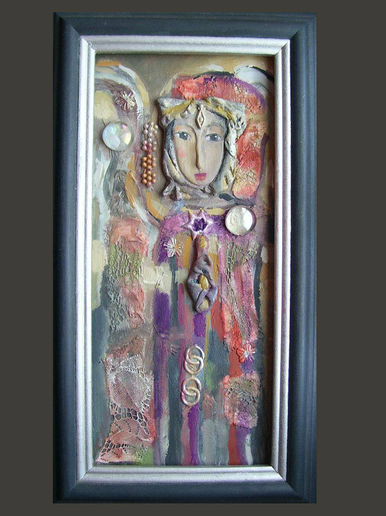 Ten obraz przyciąga wzrok swoją unikalną kompozycją i bogatą paletą barw. Dominują tu ciepłe odcienie brązu, fioletu i różu, przeplatane z delikatnymi akcentami bieli i złota. Centralną postacią jest istota o tajemniczej twarzy, której spojrzenie zdaje się przenikać przez płótno. Rzeźbione detale, takie jak koralikowy diadem i misterne wzory w tle, dodają dziełu wielowymiarowości. Obraz emanuje tajemniczym, niemal magicznym nastrojem, jakby przenosił nas do innego świata. Artysta zastosował mieszankę technik, łącząc malarstwo z elementami kolażu i rzeźby. Teksturowane tło oraz płynne linie postaci przyciągają uwagę i zachęcają do głębszego zanurzenia się w dzieło. Jest tu coś intrygującego, co sprawia, że chcesz zatrzymać się na chwilę dłużej. Dzieło może wywoływać różnorodne emocje – od fascynacji, przez zadumę, po lekką niepewność. Obserwując ten obraz, czuję się jak w bajce, w której każda postać ma własną historię. Jedno spojrzenie na to mystery i już jesteś wewnątrz, jakby artysta otwierał przed nami nieodkryty świat. Dziecko mogłoby powiedzieć: "To magia na ścianie!" W końcu, there's something enchanting in the air. Artyzm i oryginalność tego dzieła sprawiają, że trudno o nim zapomnieć.