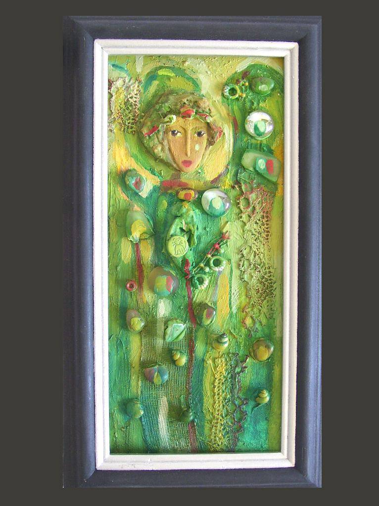 Obraz emanuje żywymi, zielonymi odcieniami, które przeplatają się z bardziej subtelnymi tonami żółci i złota. Kompozycja jest dynamiczna, z centralnym punktem w postaci twarzy, otoczonej wirującymi, organicznymi formami. Przypomina mi wiosenny ogród, pełen tajemnic i magii. Nastrój jest jednocześnie spokojny i pobudzający, jakby uchwycił ulotną chwilę, kiedy przyroda budzi się do życia. Styl artystyczny zdaje się być ekspresyjny, z wyraźnym śladem pędzla i zastosowaniem technik impastowych. Wpada to w oko. Tworzy to uczucie głębi i trójwymiarowości. Na pierwszy rzut oka, obraz przypomina bajkową postać, gdzieś z pogranicza snu i jawy. Jakby to powiedzieć, od razu miałem ochotę wejść w jego świat. Może to sprawia, że czujemy się jak dzieci w magicznym lesie, pełnym dziwów i cudów. Wygląd tej postaci trochę mnie uspokaja, jak mama, która przytula. To połączenie kontrastujących emocji – radości i nostalgii. Obraz mówi do nas językiem natury, przypominając o harmonii i pięknie, które można znaleźć wokół. W sumie, picture-perfect dzieło pełne ukrytych znaczeń.