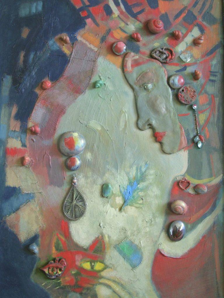 Obraz jest mozaiką kolorów, gdzie dominują ciepłe odcienie czerwieni, pomarańczy i błękitu. Widać tu postać z profilu, ale co jest najciekawsze to faktura tej twarzy, jakby stworzona z gliny lub plasteliny. Oczy rysują się delikatnie, przypominając o znajomej postaci z baśni. Włosy zdają się być wypełnione drobnymi muszlami, które przynoszą na myśl letnie wspomnienia z plaży. A po co tam tyle ślimaków? To takie magiczne! Kompozycja jest mieszaniną chaosu i harmonii. Atmosfera na obrazie emanuje czymś pomiędzy snem a rzeczywistością. Czujesz się trochę jak w bajce, w której logika nie ma wstępu. To sztuka z pogranicza snu i jawy. Techniki użyte przez artystę obejmują elementy kolażu i malarstwa olejnego, co nadaje dziełu trójwymiarowości. Texture. Czuć pod palcami te faktury, jakby chciały opowiedzieć historię. A emocje? Zaskoczenie miesza się z lekką nostalgią. Obraz może wywoływać refleksję nad ulotnością chwili czy naturą rzeczywistości. Może nawet lekko uśmiechniesz się, patrząc na tego zaskakującego kota w dolnej części obrazu, który wydaje się pilnować tajemnic tego świata. Cóż za niezwykłe dzieło pełne emocji i tajemnic.