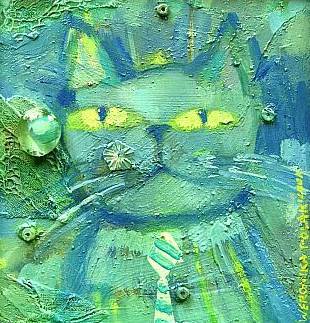 Obraz tętni życiem, jakby ktoś wrzucił wszystkie odcienie zieleni i niebieskości do wirującego kalejdoskopu. W centrum uwagi jest kot z hipnotyzującymi, żółtymi oczami, które zdają się świdrować widza na wskroś. Jego wąsy są jak pędzelki, pociągnięte z finezją przez artystę. Tekstura obrazu jest bogata, niemal trójwymiarowa, jakby kto wylał na płótno farbę i zostawił ją do snucia opowieści. Atmosfera obrazu jest ciepła, a zarazem nieco tajemnicza, like a secret whispered in the wind. Styl artystyczny lekko przypomina impresjonizm, ale jest bardziej dzikie, bardziej ekspresyjne. Farby są nałożone grubymi warstwami, co buduje intensywność obrazu. Interpretacja? Może to po prostu szczęśliwy kot, który przechadza się w zielonym świecie pełnym słońca. Może to przypominać niektórym dzieciństwo na wsi. A kotek wygląda tak, jakby potrafił mrugnąć! Jak patrzę na ten obraz, czuję taki spokój, ale i zaintrygowanie, jakbym czytał książkę, której jeszcze nie znam zakończenia. Świadomość użycia barw, plamek światła i ciemności tworzy efekt, jakby kot mógł w każdej chwili wyskoczyć z płótna.
