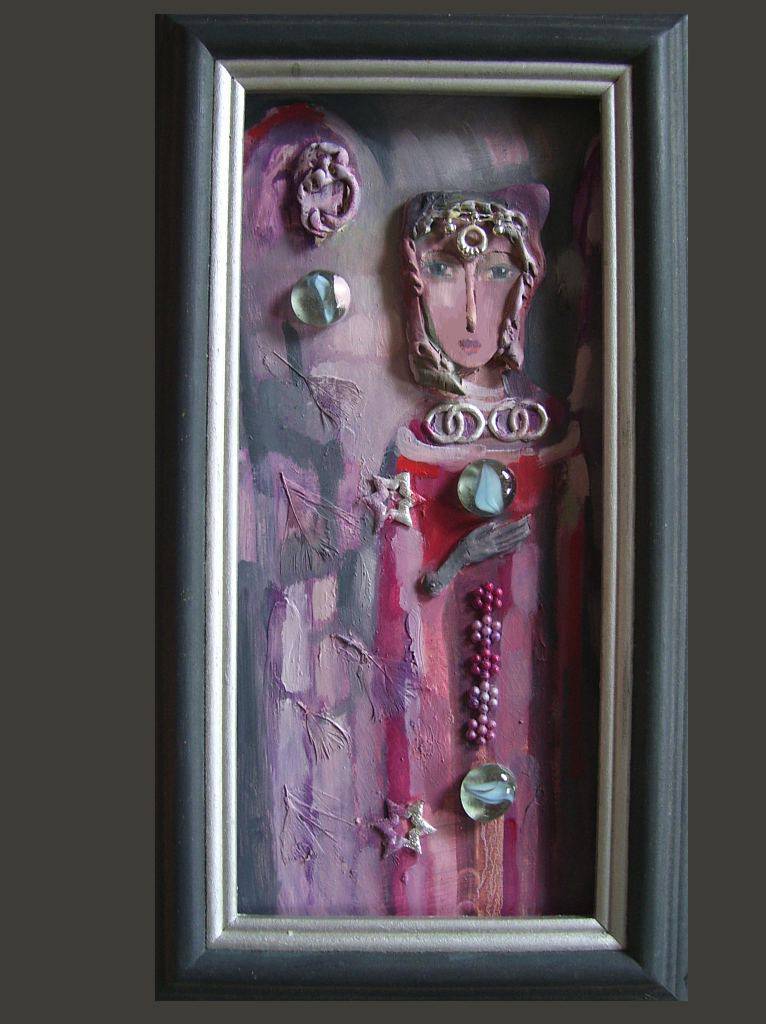 W ramie o delikatnym połysku, widać obraz pełen tajemniczych odcieni różu i fioletu, które dominują kompozycję. Te subtelne kolory tworzą miękkie tło, kreując eteryczną aurę. Na pierwszy plan wysuwa się tajemnicza postać. Jej twarz, ozdobiona bogatą biżuterią, z wyrazistym spojrzeniem, emanuje spokojem i zadumą. Wykorzystanie tekstur to mistrzostwo. Można dostrzec trójwymiarowe elementy, takie jak kryształki i koraliki, które dodają głębi i intrygują szczegółowością. Styl pracy przypomina technikę mixed media, gdzie artysta bawi się różnorodnością materiałów. Ten klejnot sztuki przyciąga wzrok i zakorzenia uczucie zaciekawienia, a może nawet zdziwienia. Patrząc na ten obraz, można poczuć nostalgiczną melancholię, jakby zatracenie się w świecie snów. "Ale fajne koraliki!" – pomyślałoby dziecko, skojarzenia dziecięcej fascynacji. Obraz ma w sobie coś magicznego, takiego "je ne sais quoi", co sprawia, że chce się patrzeć bez końca. To dzieło wyraża subtelną grę światła i cienia, balansując między snem a jawą. Osobiście, przypomina mi wieczory spędzone na rozmyślaniu o rzeczach niewyobrażalnych. Szlachetna prostota kontrastuje z bogactwem detali, wywołując uczucie spokoju. Gdy patrzysz, zaczynasz zadawać pytania. Kto to jest? Co chce nam powiedzieć? To obraz, który na pewno zostanie w pamięci na długo.