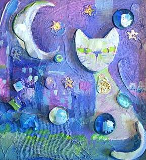 Obraz pełen jest kolorów i kształtów, które przyciągają wzrok niczym magnes. Dominują odcienie fioletu, błękitu i zieleni, które tworzą harmonijną całość. Na pierwszym planie widzimy kota o nieco geometrycznych kształtach, prawie jakby był wycięty z kolorowego papieru. W tle lśni księżyc w towarzystwie niewielkich, migoczących gwiazd. Atmosfera obrazu jest senna, prawie magiczna. Jak w bajce, gdzie wszystko jest możliwe! Artysta użył różnych technik, łącząc elementy malarskie z kolażem. Wydaje się, że tekstura farby jest gruba, co dodaje obrazu głębi i życia. Ktoś mógłby powiedzieć, że dzieło jest "dreamy". Popatrz, te duże szklane kule wyglądają jak krople deszczu zamienione w klejnoty. Ciekawe, jak ten kot się tam znalazł? Siedmiolatek mógłby napisać: kot siedzi pod księżycem i patrzy na gwiazdy. Ten obraz wywołuje uczucie spokoju, a zarazem jakiejś tajemniczej energii, która rozbudza wyobraźnię. To dzieło pobudza do refleksji, może trochę nostalgiczne. Może w nas coś budzi, może zachęca do rozmyślań o nocnych marzeniach i sekretnych myślach.