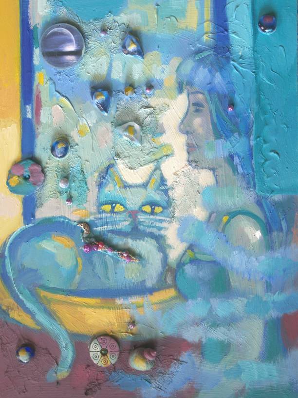 Obraz emanuje niezwykłym, tajemniczym urokiem. Paleta kolorów błękitu i żółci tworzy niesamowitą symfonię, niemal jak w snach. Na pierwszym planie dostrzegamy kota, o oczach jak dwie złote monety, który zdaje się przenosić nas w inną rzeczywistość. Towarzyszy mu delikatna postać w tle, której obecność przywodzi na myśl uczucie nostalgii i marzenia. Tło zdaje się pulsować słabymi bąbelkami i rozmazanymi smugami, które potęgują senną aurę. Technika użyta przez artystę to subtelne mieszanie impresjonistycznych pociągnięć pędzlem z bardziej surrealistycznymi elementami. Czuć tu wpływy dreamlike stylu, który nie tylko przyciąga wzrok, ale i wywołuje refleksje. Klimat obrazu jest wręcz ethereal, przypominając niekończący się sen. Patrząc na dzieło, można poczuć spokój, ale jednocześnie lekkie napięcie. Co kot widzi swoimi przenikliwymi oczami? Moja siostra mówi, że on widzi kosmos! Może nawet ten mały świat w ramie jest odzwierciedleniem naszych ukrytych pragnień i lęków. Taki obraz jest jak podróż do innego wymiaru, pełna pytań i emocji.