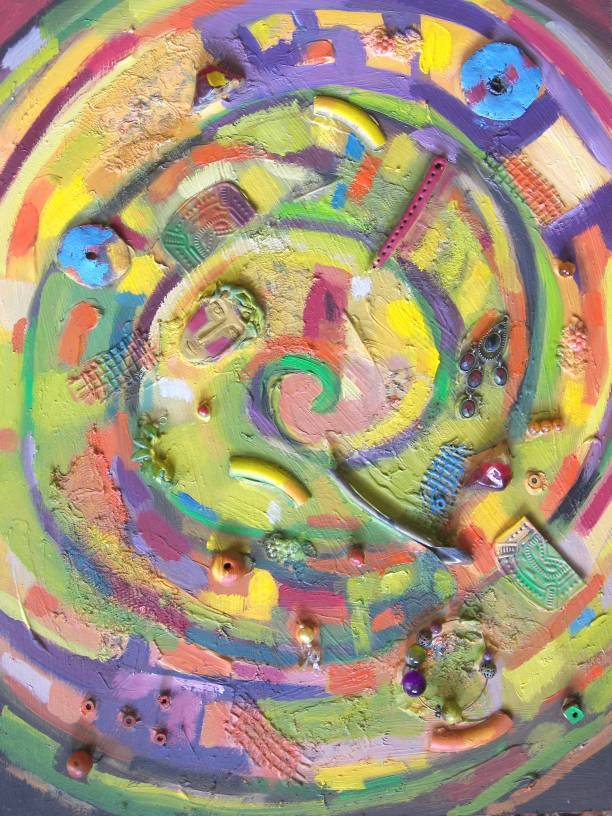 Obraz pulsuje kolorami, tworząc dynamiczną, spiralną kompozycję pełną energii i ruchu. Dominują ciepłe żółcie, pomarańcze i fiolety, które płynnie przechodzą w zimne błękity i zielenie, mieszając się w wirujący kalejdoskop. W centrum obrazu znajduje się intrygująca spirala, która zdaje się wciągać widza w swoje głębiny. Artysta zastosował technikę impasto, tworząc trójwymiarowe faktury i struktury. Widać tu bogactwo detali, jakby malarz chciał powiedzieć: zobacz, to niezwykły świat, pełen ukrytych historii. Obraz emanuje radością, ale i tajemniczością. Bawi się z odbiorcą, prowokując go do zatrzymania się na dłużej i odnalezienia swojego własnego znaczenia. Wygląda, jakby dziecięcy entuzjazm spotkał się z dojrzałą refleksją. Powoduje, że czuję się jak w bajce, gdzie wszystko jest possible. Mały Jasio mógłby powiedzieć: To wygląda jak cukierkowe tornado! Patrząc na ten obraz, można poczuć się jak na niekończącym się festiwalu kolorów.