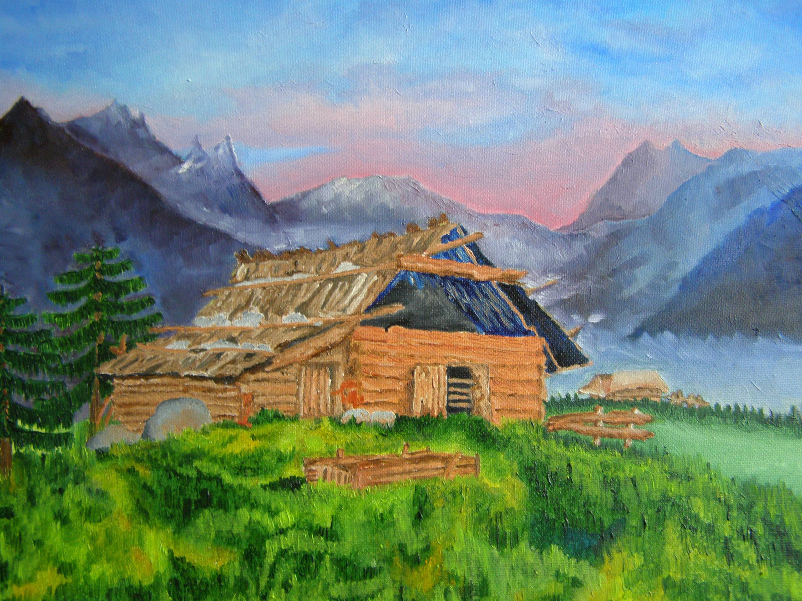 Na obrazie widzimy malowniczy krajobraz górski z drewnianą chatą na pierwszym planie. Chata, choć nieco zaniedbana, ma swój urok z wyraźnymi śladami czasu. Jej brązowe deski, przysłonięte dachem, konweniują z bujną zielenią otoczajacej ją trawy. W tle majestatyczne góry, pokryte ośnieżonymi szczytami, toną w niebieskawych odcieniach, które przechodzą w różowawy, poranny blask nieba. Atmosfera emanuje spokojem i pewną nostalgią, jakby zatrzymał się czas. Sposób, w jaki artysta nałożył kolory, sugeruje użycie techniki impasto, która dodaje teksturę i głębokość całemu dziełu. Obraz ten przykuwa uwagę swoją prostotą i naturalnością, jednocześnie prowokując refleksję nad przemijaniem i pięknem natury. Użyta paleta barw - dominacja zieleni, błękitów i ciepłych brązów - tworzy harmonię i poczucie jedności. Kształty i linie prowadzą wzrok w kierunku gór, skąpanych w tajemniczej mgiełce. "Wow, ale ładne te góry!” – mogłoby powiedzieć dziecko. Emocjonalnie, obraz wywołuje uczucie zadumy, a także wewnętrznego ciepła. Chciałoby się tam być, choć na chwilę, oderwać od codziennego chaosu i zatopić w spokoju natury. Ten little trace of serenity sprawia, że aż chce się westchnąć z zachwytu. Widzowi pozostaje tylko marzyć, że kiedyś znajdzie się w takim magicznym miejscu.